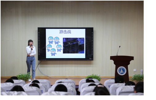 首先,柳丽为同学们播放了一段抗战老兵的采访视频,视频中老兵展示了他曾经得过的荣誉勋章,极大地引起了同学们的听课兴趣,引出此次讲课的主题----抗日战争。为了让同学们更深入地了解抗日战争的背景,柳丽用一组形象生动的动漫人物向同学们展示了抗日战争敌我双方战斗力对比,现场学生的听课积极性很高。柳丽又采取了现场问答的方式进行讲解,通过提问“抗日战争持续了多长时间”和“抗日战争的最终结果”等一系列问题,用幽默诙谐的语言向同学们详细地讲解了抗日战争的影响。在最后的传话游戏环节中,同学们默契配合,互帮互助,共同完成了有趣的传话游戏。最后,柳丽为奖励认真听讲的同学,给学生们分发糖果。在整场互动性极强的讲课中,孩子们收获了许多关于抗日战争的历史小故事,活动在欢乐融洽的氛围中圆满结束。