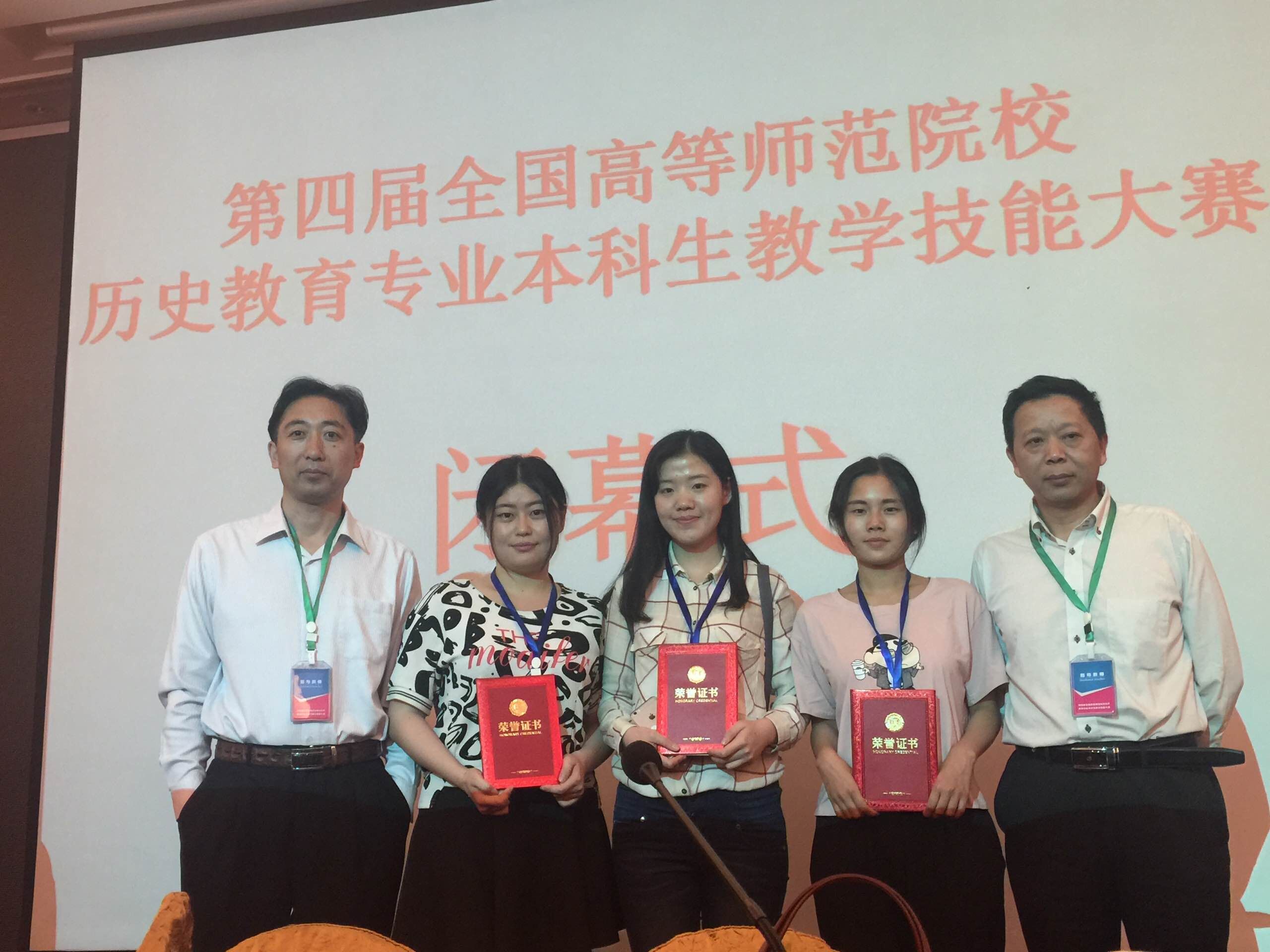 2016年5月6日至9日,第四届全国高等师范院校历史教育专业本科生教学技能竞赛在江西师范大学举行。来自部属重点师范大学以及省属重点师范大学和地方师范学院在内的76所高师院校的220余名学生同场竞技。全国一等奖的获奖比例为参赛选手的10%、全部获奖比例约为参赛选手的50%。历史与社会发展学院选派的2012级本科生孙衍盼、徐铭汕、宋伟代表我校参加比赛并取得了优异成绩。孙衍盼荣获讲课比赛一等奖,徐铭汕、宋伟分别荣获说课比赛一等奖和三等奖。此外,历史与社会发展学院获得优秀组织单位奖,楼建军、仇世林两位老师荣获优秀指导教师奖。