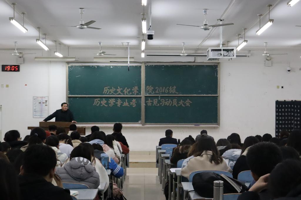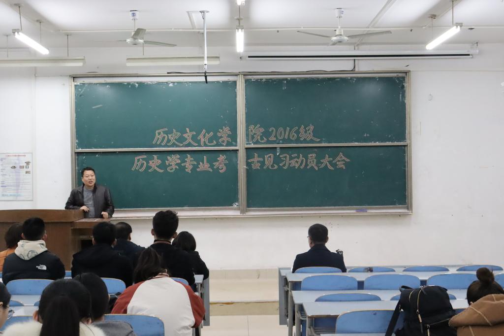 11月17日历史文化学院于长清湖校区综合教学楼c区117教室举办2016级历史学专业考古见习动员大会,学院党委副书记鲁法军,副院长赵树国,学院团委书记、学工办主任、2016级辅导员魏宁,教师代表邵文臣、王静出席此次会议,近两百名同学参会。