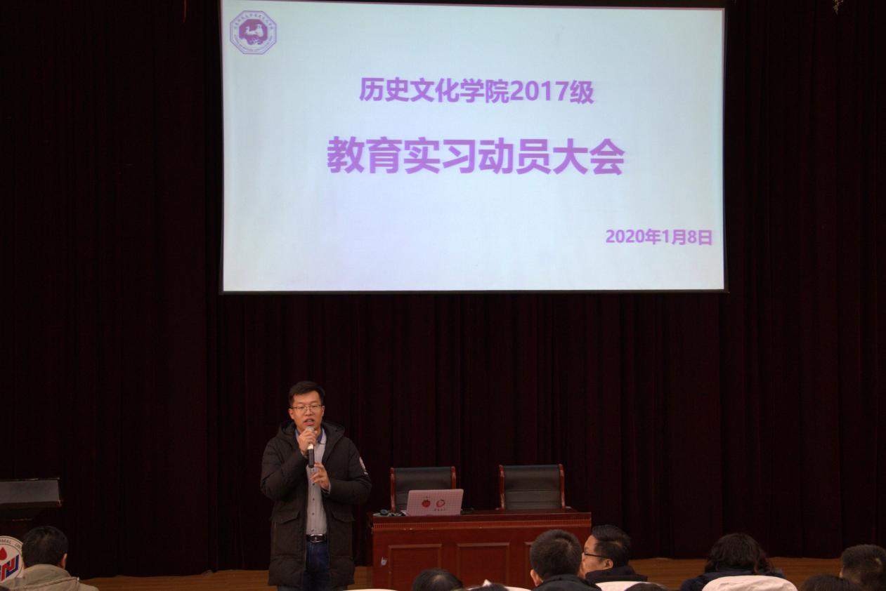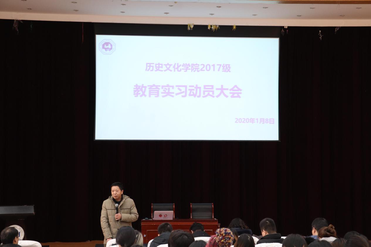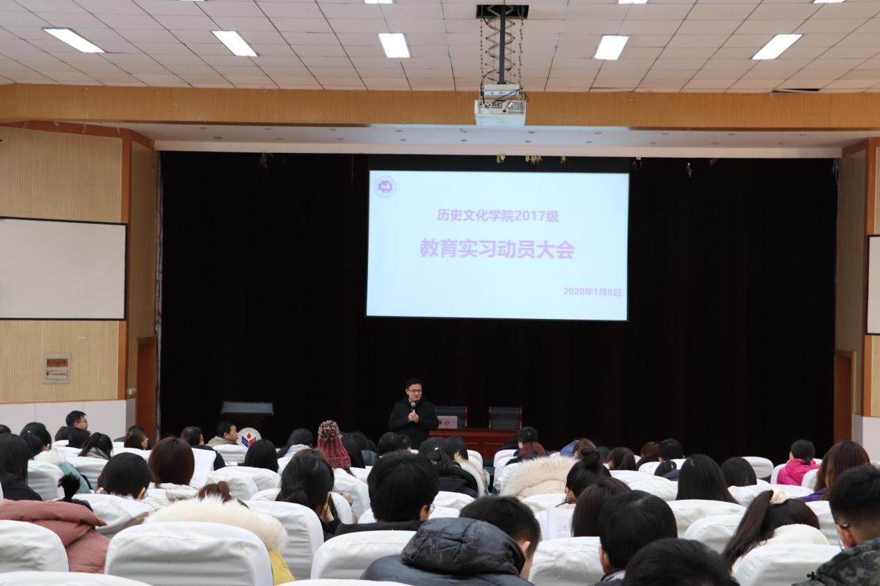 为做好2017级教育实习工作,提高学生的教育实践能力。1月8日,历史文化学院于长清湖校区文渊楼C154报告厅召开2017级教育实习动员大会。学院党委副书记鲁法军,副院长赵树国,教师教育中心主任楼建军,学院11位教育实习指导教师参加会议。2017级历史学专业全体本科生到场参会。会议由2017级辅导员衣晓杰主持。