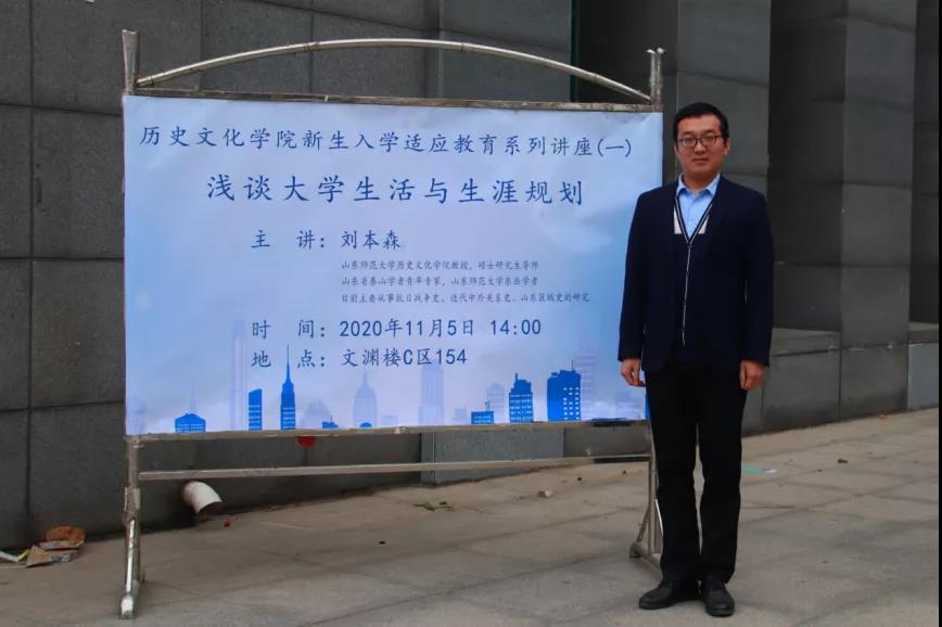 为了帮助大一学生更好地融入大学生活、做好未来规划。11月5日下午,历史文化学院于长清湖校区文渊楼C区154报告厅举办了新生入学适应教育系列讲座(一)之“浅谈大学生活与生涯规划”。本次讲座由我院中国史系副主任、硕士研究生导师、山东省泰山学者青年专家、山东师范大学东岳学者刘本森教授担任主讲嘉宾,2020级辅导员蒋艺及全体2020级同学共同聆听了本次讲座。