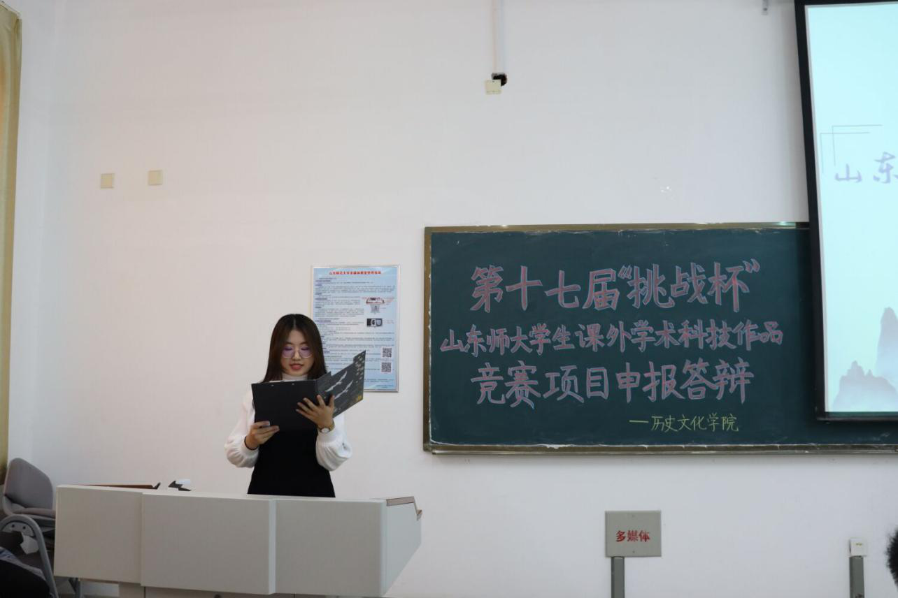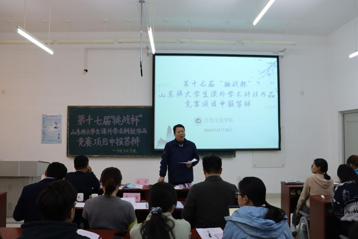 为了树立大学生挑战创新观念,培养学生实践能力。11月10日,历史文化学院于长清湖校区崇德楼218教室举办了“挑战杯”答辩活动。学院党委副书记鲁法军老师,学院副院长、硕士生导师赵树国副教授,学院学生工作办公室主任、团委书记、2018级辅导员魏宁老师,泰山学者青年专家、硕士生导师刘本森教授,2017级辅导员衣晓杰老师受邀参加本次答辩活动。