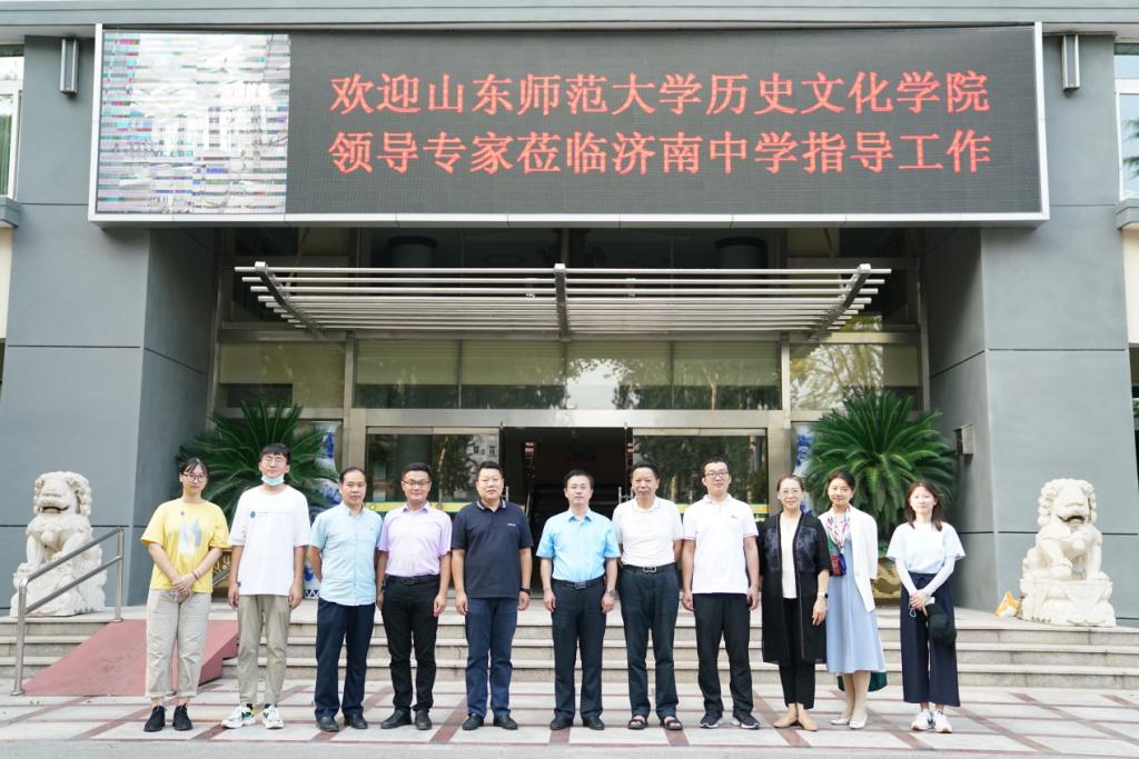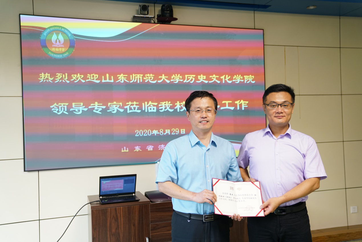 2020年8月29日,在山东师范大学历史文化学院与山东省济南中学教育硕士实习合作十周年之际,历史文化学院在山东省济南中学举行教育硕士实习调研座谈会暨导师续聘仪式。济南中学校长董亚、党委副书记董翠娟、校长助理董洪海、教务处主任刘欣,历史文化学院党委副书记鲁法军、副院长赵树国、教师教育中心主任、学科教学(历史)专业硕士点负责人楼建军、中国史系副主任刘本森以及全体教育硕士实习学生出席活动。