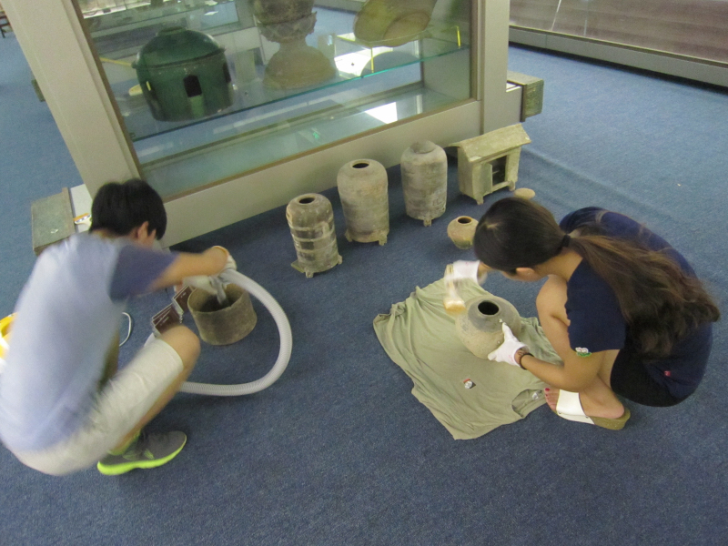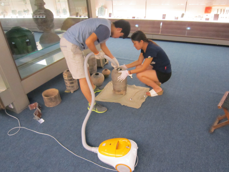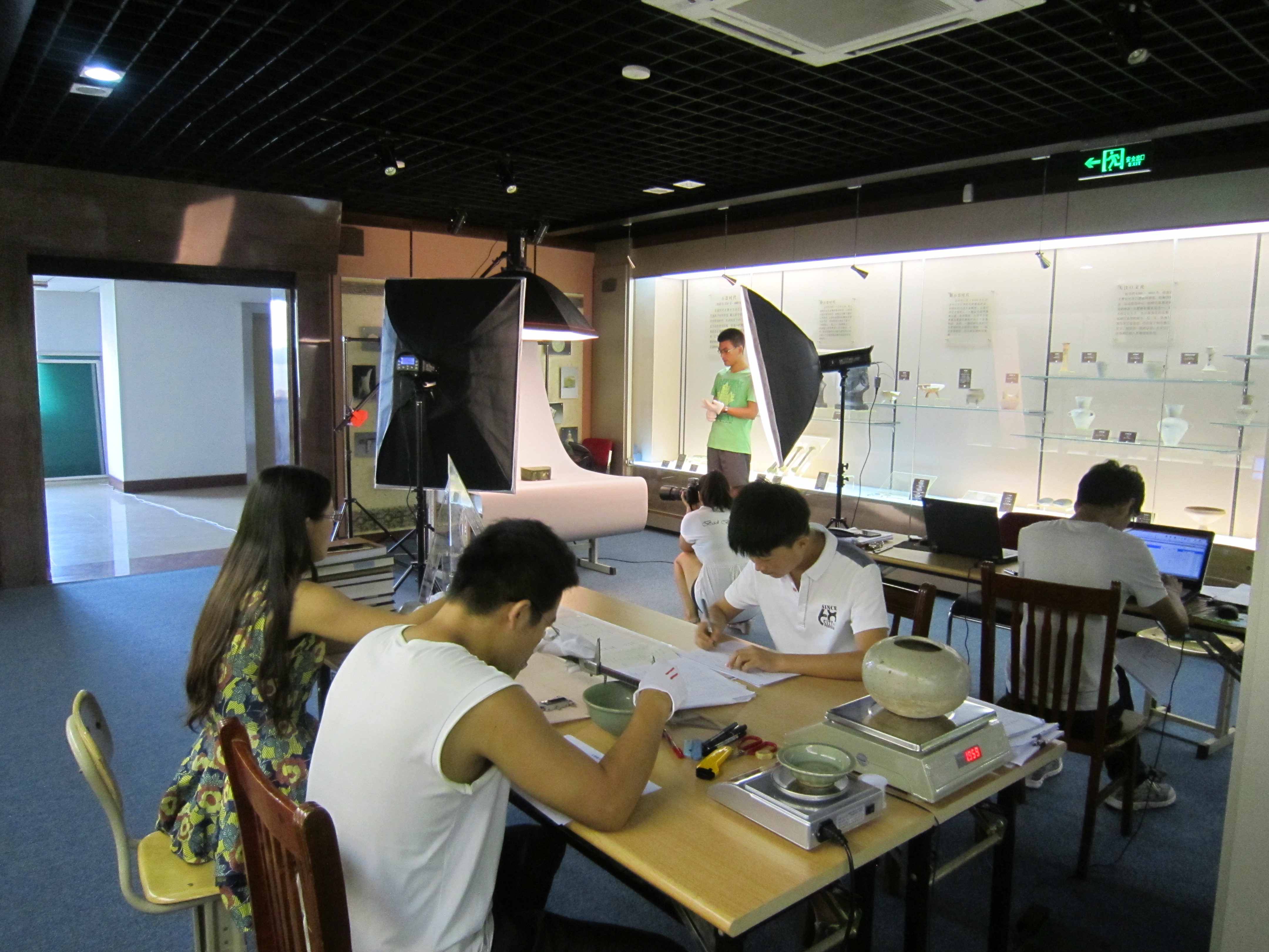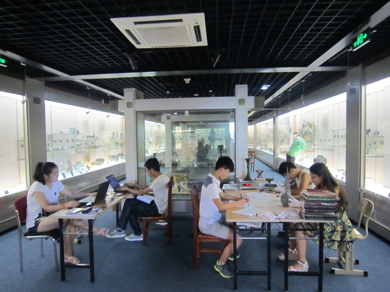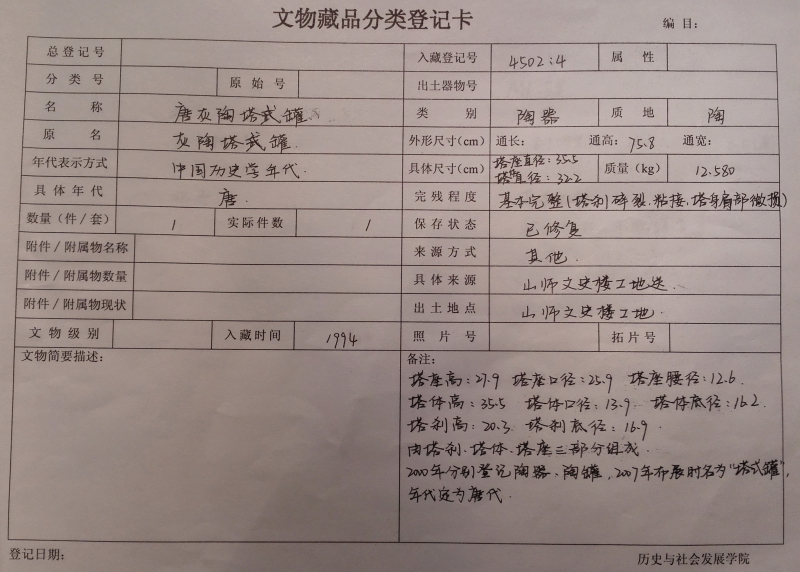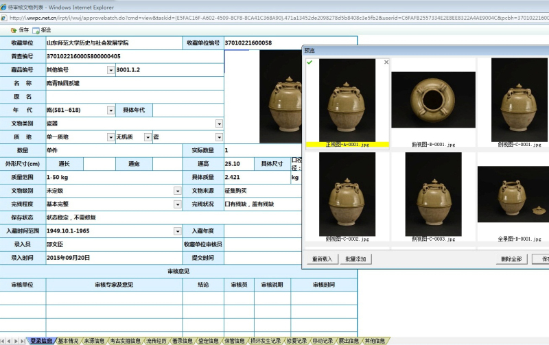 2015年6月中旬接到省文物局和学校下达的可移动文物普查任务之后,学院领导班子召开专门会议研究此事,委派邵文臣老师具体负责此项工作。邵文臣老师接受任务之后,在省文物局普查办的指导和学校领导与学校普查负责机构社科处的领导和协调下,从考察了解所需仪器设备和用品并完成采购,到分批邀请省文物局、省博物馆、济南市文化局、山东大学和省考古所等不同文物考古领域的多位专家学者前来帮助鉴定传世和采集文物的真伪和年代(我院所藏文物绝大部分为传世和采集品,鉴定真伪和年代是做好普查工作的前提)。从带领学生志愿者(先后有11位学生参与,最多时6人,最少时1人)接收培训、熟悉普查规程和要求,到文物除尘、测量称重、拍照、模板录入和上传数据(由于网路堵塞,数据上传国家文物局系统基本是利用深夜和早晨文博系统上传的间隙时间段完成的)。至2015年9月下旬(主要是暑假期间),为我院收藏的全部文物(包括未普查的少量赝品)按普查要求测了尺寸、称了重量、拍了照片,并观察记录了其完残状况和保存状态,同时也为在展的文物复仿制品测量了数据,并为全部文物和在展的文物复仿制品建立了档案。因而在保障质量的前提下,很好地完成了普查和数据上传任务,得到了学校领导和省文物局普查办的好评。以下为普查掠影: