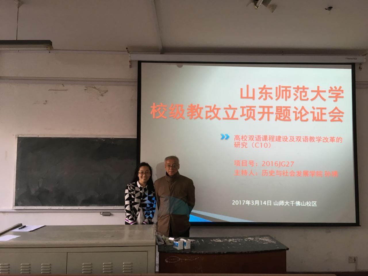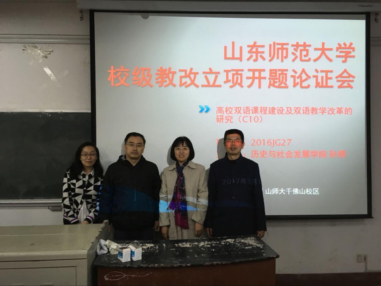 3月14日,历史与社会发展学院召开《高校双语课程建设及双语教学改革的研究》开题论证会,此项目已获得我校教改立项重点资助。开题会在千佛山校区教学三楼3240室举办。与会专家和项目主要成员包括:山东师范大学历史与社会发展学院院长毛锐教授,副院长张登德教授,博士生导师陈海宏教授,世界史硕士点负责人、硕士生导师王静教授等人。