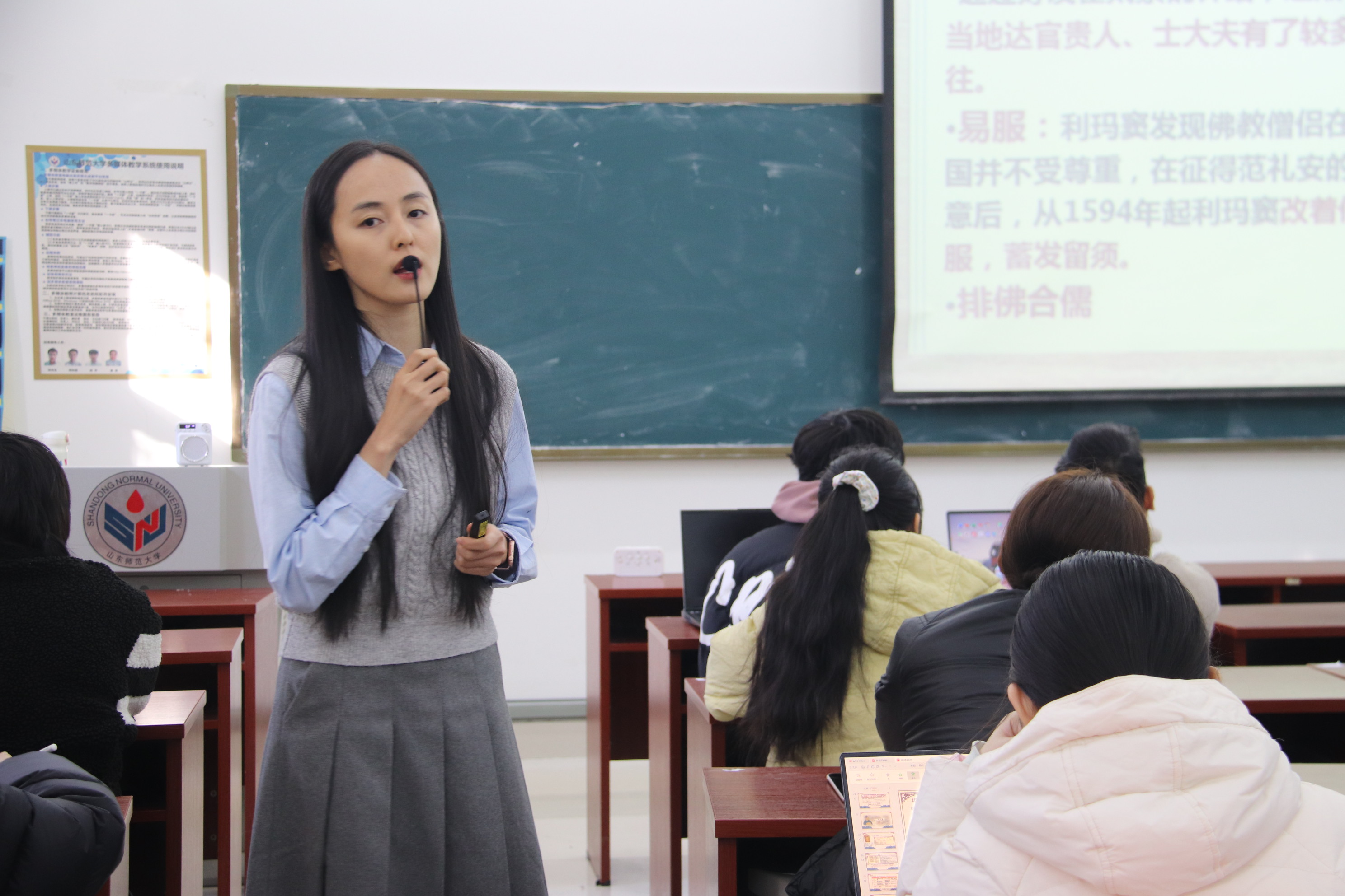 本节课以“明代中西文化交流”为课程主题,旨在阐释中外文化交流互融的关系,展现开放包容的中华优秀传统文化,与当今时代主题形成呼应。在课堂导入环节,于亦璇通过一段关于利玛窦的访谈视频引出了本节课的主题,然后开篇明义,展示了本次课的主要内容:耶稣会在东亚的早期传教、利玛窦的在华活动、利玛窦的传教策略、传教士的文化贡献,以背景—内容—影响的逻辑结构,将本堂课串联起来。接着,她以沙忽略、范礼安为例,讲述了耶稣会在东亚的早期传教活动,以点带面,揭示了西方文化传入中国的历史背景,而后过渡到对利玛窦在华活动的具体讲述。于亦璇将利玛窦的在华活动分为四个阶段,呈现了一个西方人士东方化的过程,紧接着阐述了利玛窦的传教策略——适应政策,通过一系列举证展现了明代由传教士推动的东西方文化交流的状况。最后,于亦璇通过引用名家语录、著作总结了传教士的文化贡献,并引导同学们对此进行辩证性思考,还推荐了相关著作,鼓励同学依据自身兴趣进一步探索“明代东西方文化交流”的主题。本堂课立意鲜明、条理清晰,得到了学院各指导教师的一致认可。