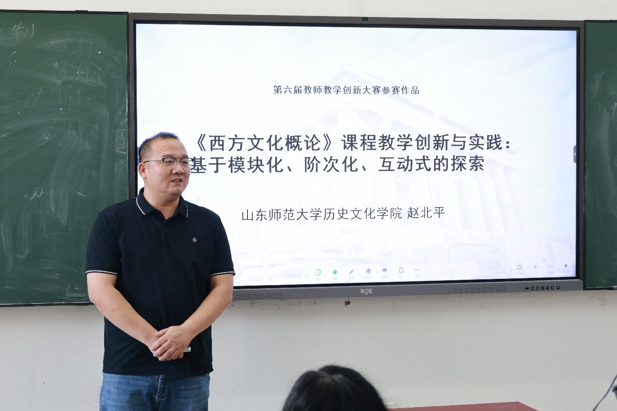 赵北平副教授从模块化、阶次化和互动式三个维度介绍了《西方文化概论》课程的创新与实践,通过认真分析课程的痛点,提出针对性的解决措施,并在此基础上介绍了课程实践的相应成果。