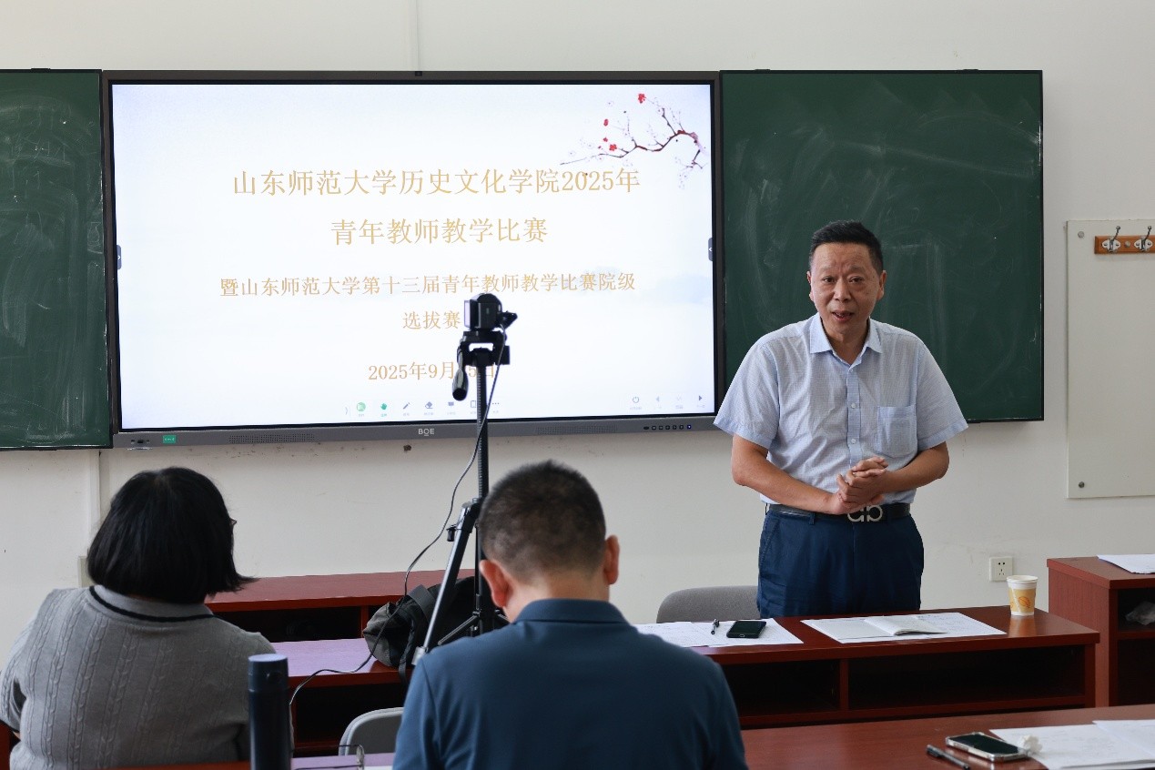 为了进一步提升我院青年教师教学水平,2025年9月25日下午,历史文化学院于崇德楼320教室举行了2025年青年教师教学比赛暨山东师范大学第十三届青年教师教学比赛院级选拔赛。本次活动由中国史系主任杜学霞主持,学院教学督导组楼建军教授、杨蕾教授、李晓华副教授、魏永生副教授、王保宁副教授、孙小娇副教授、盖志芳副教授担任评委,青年教师于亦璇、张凯成、丁燕杰、李敏、刘倩、宋化玉参赛。
