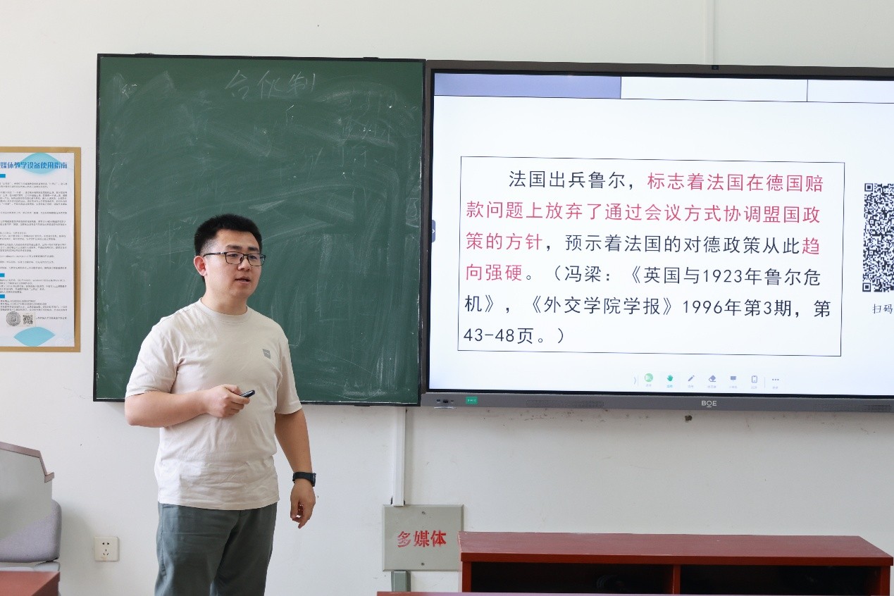 张凯成老师以“鲁尔危机”为题,结合多方史料,通过精彩互动和清晰板书,向大家讲解了鲁尔危机爆发的背景、过程及原因,最后强调了和平是终结国际危机的最优解。同时,他向大家推荐延伸阅读书籍以及相关论文。