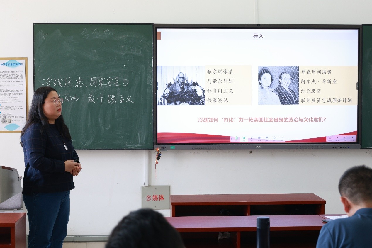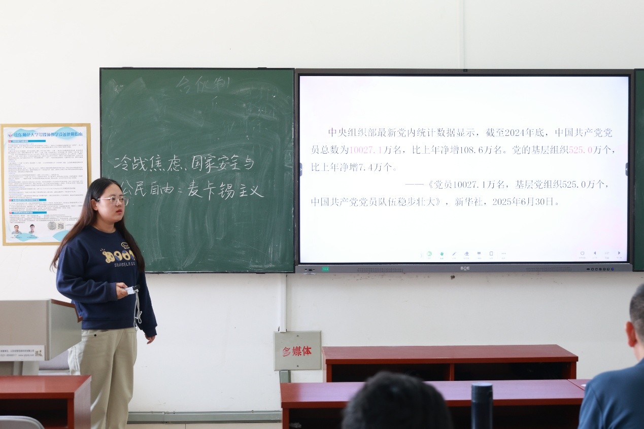 李敏老师以“冷战焦虑、国家安全与公民自由:麦卡锡主义”为题进行课堂展示,她首先以美国物理学家遭受调查的故事为引入,又通过详细具体的图表数据和有关史料进一步深刻分析了麦卡锡主义出现的原因和过程,并联系现实揭示了麦卡锡主义的社会影响,让听众更具体更生动地理解这一段历史。