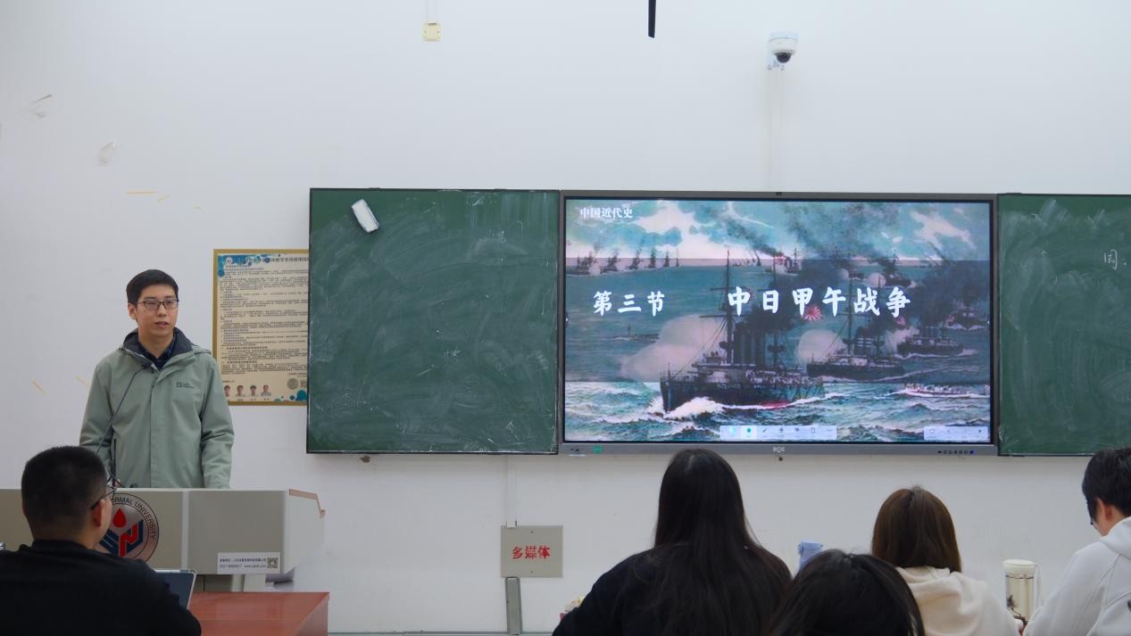 在课堂展示中,陈甘霖以近代中国边疆危机为切入点,抛出极具启发性的思考:随着时代变局,中国的危机重心已从传统陆疆转向海疆。日本步步紧逼的扩张行动严重威胁到中国,最终引爆了甲午中日战争。为厘清战争爆发的深层根源,陈甘霖进一步对日本的侵华扩张野心进行溯源:丰臣秀吉时期便有“征韩侵华”构想,近代以来在“脱亚论”及“宇内混同说”“大东合邦论”等扩张思想的推动下,日本形成了以“占朝鲜、吞中国”为核心的大陆政策,这为后来的战争埋下了伏笔。随后,陈甘霖聚焦日朝关系的演变,揭示其与甲午战争的紧密关联:传统的通信使、岁遣船模式,无法满足明治维新后日本的扩张需求。日本想把朝鲜当侵华跳板,这成为其介入朝鲜事务的动机,也让朝鲜问题成为甲午中日战争的导火索。为清晰呈现战争爆发的直接脉络,陈甘霖梳理了一系列关键事件:江华岛事件日本打开朝鲜国门;壬午兵变、甲申政变后,日本签《仁川条约》《天津会议专条》,获在朝驻军权等特权,更取得了与清朝在朝鲜的“对等地位”。《天津会议专条》更为之后的中日战争埋下直接祸根。最后,陈甘霖进行课堂总结,即甲午中日战争爆发不是偶然的,而是日本在不断膨胀的扩张野心驱使下推行侵略的“大陆政策”并不断主动挑衅的结果,因而成为近代中国边疆危机集中爆发标志性事件。