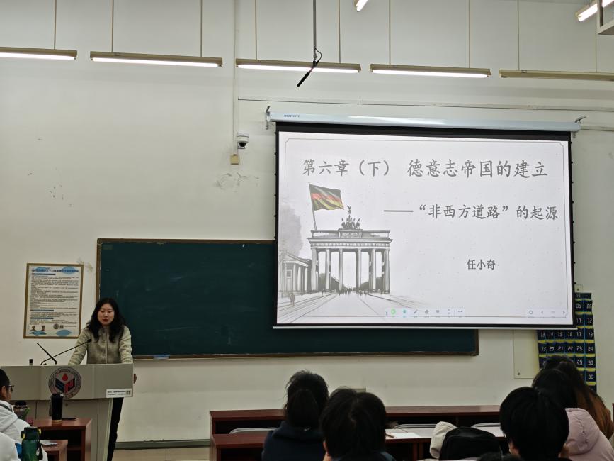 第五场公开课伊始,任小奇以“西方”概念为切入点,从不同角度分析了学术界对于德意志帝国的建立道路的有关争论,通过梳理德意志帝国“非西方道路”的起源,带领同学们回顾学术史。接着,任小奇分别从统一背景、俾斯麦个人层面,介绍了德意志从四分五裂走向统一的过程。这一过程既离不开人民对统一的诉求与德意志关税同盟的推动,也离不开俾斯麦个人的巨大努力。课堂上,同学们围绕铁血演讲中“铁”“血”与“角色”的内涵展开讨论,加深了对“实力”“武力”和“强权”在德国统一中实际作用的认知。随后,在讲解《德意志帝国宪法》时,针对其中的联邦制与君主立宪制规定,任小奇结合史料着重指出宪法中自相矛盾的条款,帮助同学们更深入理解德意志帝国“非西方性”所蕴含的矛盾性与妥协性。