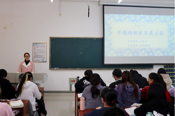 首场公开课由青年教师冯秀香进行讲授。在李伟教授指导下,冯秀香老师以“早期维新派及其主张”为题,从早期维新派的身份构成、思想主张、思想评价三个方面进行系统讲述。在充分运用史料、图片资料、表格等教学方式基础上,细致解析了王韬、容闳、郑观应、薛福成、马建忠、陈炽、陈虬等早期代表性维新人物的成长经历与思想主张,并由此引申出早期维新派的两种身份构成以及群体特征,重点指出其与洋务派的复杂关系。本课通过师生互动的方式,学生讲述与老师点评补充相结合,充分调动起学生参与学习的积极性与主动性。