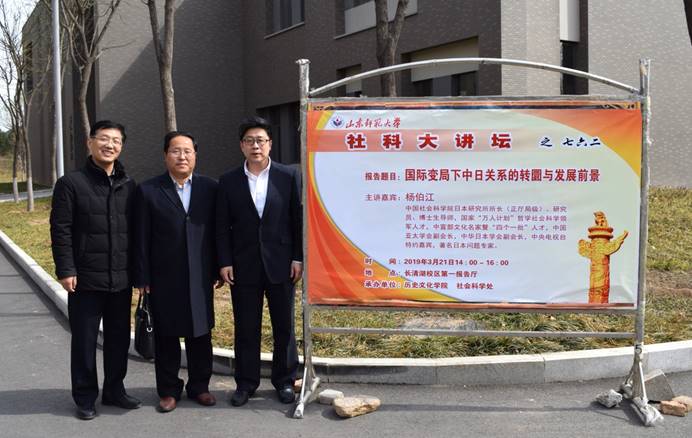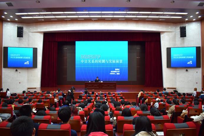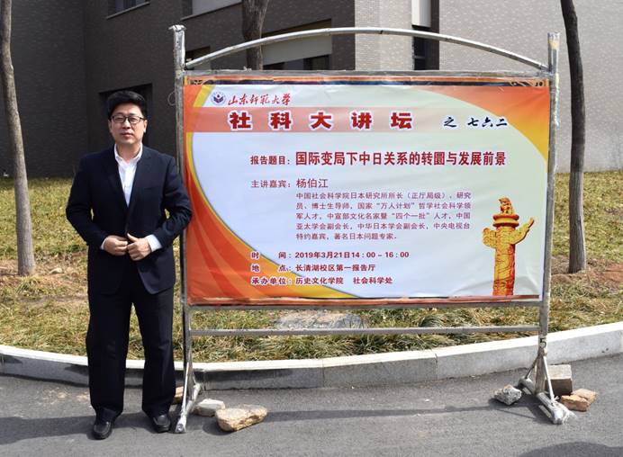 3月21日下午,由我校历史文化学院、亚太研究中心和社会科学处联合承办的第762期社科大讲坛在长清湖校区第一报告厅开讲。本次社科大讲坛特别邀请中国社会科学院日本研究所所长、博士生导师,中国亚太学会副会长、中华日本学会副会长杨伯江研究员担任主讲人,作了题为“国际变局下中日关系的转圜与发展前景”学术报告。讲座前,我校副校长王洪禹、历史文化学院院长毛锐等领导会见了杨伯江先生,对杨先生再次莅临我校讲学和指导工作表示热烈欢迎,对先生长期以来支持我校学科建设表示衷心的感谢。本次报告由山东师范大学历史文化学院党委副书记颜春杰主持,山东师范大学亚太研究中心主任、历史文化学院二级教授、博士生导师孙立祥担任评议人,历史文化学院400余名师生聆听了此次讲座。