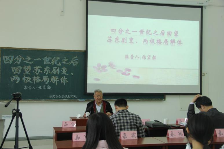在处理中美新型大国关系的同时,中俄关系、美俄关系该如何发展,这也是值得我们深思的。张宏毅教授4月20日下午的第三场报告以“四分之一世纪之后回望苏东剧变、两极格局解体”为主题,从历史与现实结合的角度审视了苏东剧变及其对俄中关系、俄美关系的影响。张宏毅教授首先强调,当下的世界形势转瞬即逝、问题复杂多样,在研究中需要特别关注并了解中国在其中发挥的历史作用。接着,张宏毅教授由“苏东剧变、两极格局解体是否意味着资本主义在世界的胜利”这一问题引入,条分缕析地讲解了解体后的苏联、美国、中国的社会状况。他指出,苏东剧变、两极格局解体时,美国正值扩展资本主义的好时期,并且将中国视为“最后一个眼中钉”;中国面对外界普遍存在偏见的严峻形势,坚定走社会主义道路;而解体后的苏联面临着国民生产总值下降、文化教育条件削弱、人口减少的社会惨状,过了很长一段时间才摆脱苏东剧变的阴影。随后,张宏毅教授紧跟时代脉搏,详细地为同学们讲解了苏联解体以来四分之一世纪世界历史变化的六个特点:一是世界进入了信息革命时代,科学技术的发展日新月异;二是经济全球化速度加快,经济全球化所具有的“双刃剑效应”使各国对全球化的态度与反应不同;三是世界多极化趋势不可逆转,全球化会让更多的人享受到好处;四是,美国极欲称霸全球,对中国、欧洲国家等带来了极大的影响;五是在西方重压下,俄罗斯成为西方的一大心病;六是中国强劲的崛起影响世界发展方向。最后,张宏毅教授揭示了过去的四分之一世纪中历史剧变给人们的理论启示。结合第二场讲座中提到的环球视野中中国共产党这一主题,张宏毅教授强调社会主义国家必须要根据各自的国情进行发展建设、改革创新,要坚持正确的唯物史观,把这四分之一世纪放在大的历史长河里看,正确分析历史。此外,张宏毅教授还提醒,无论是党政领导还是我们大学学子,在21世纪仍要认真学习马克思主义,努力提高理论素养,这样才能避免苏联革命理论愈加僵化的教训。