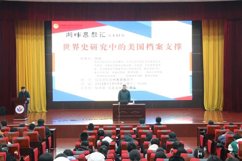 11月19日,由校团委、历史文化学院团委联合举办的“湖畔思想汇”第331期“世界史研究中的美国档案支撑”在长清湖校区树蕙堂报告厅举行。本次讲座由华东师范大学历史学博士、现山东师范大学历史文化学院讲师陈锐担任主讲,近300名历史文化学院2024级本科生参加本次分享会。讲座由2024级本科生辅导员于一凡主持。