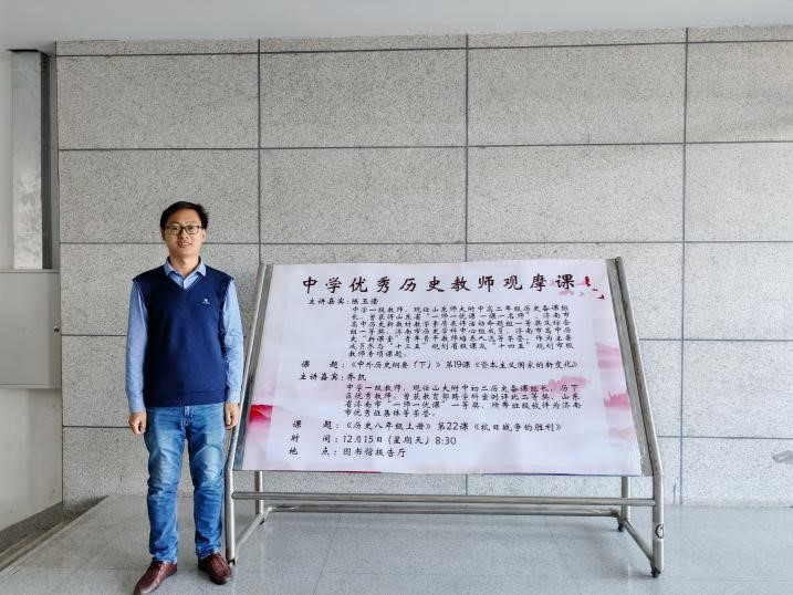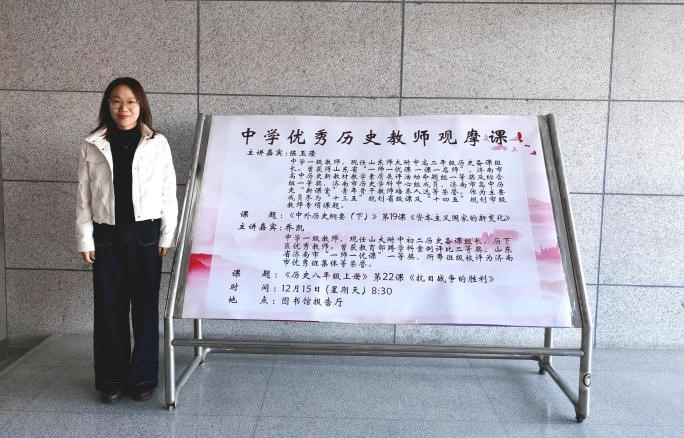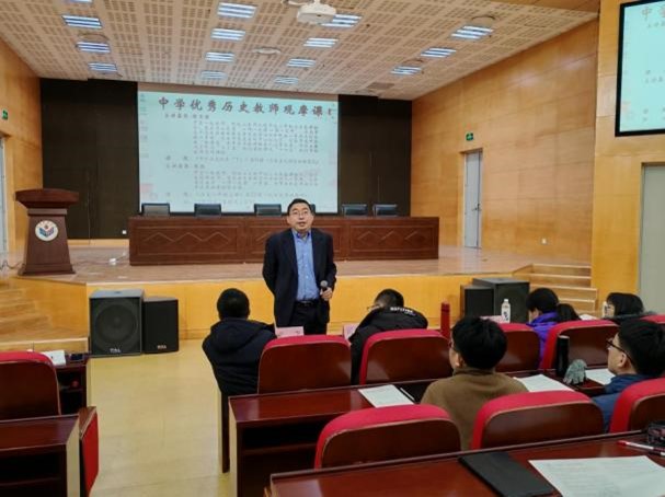 为促进师范生专业化成长,构建师范生体系化培养路径,12月15日上午,历史文化学院在图书馆报告厅举办“中学优秀历史教师观摩课”活动。本次观摩课由山东大学附属中学教师乔凯和山东师范大学附属中学教师陈玉滢分别主讲,讲课题目为初中历史八年级上册第22课“抗日战争的胜利”和高中《中外历史纲要(下)》第19课“资本主义国家的新变化”。活动由燕慧副教授主持,学院教师董飞、闫福新、祝介梅,兼职硕士生导师赵然,2022级辅导员孟晓雨出席,2024级学科教学(历史)专业研究生和2022级全体历史学(师范)专业本科生参与此次活动。