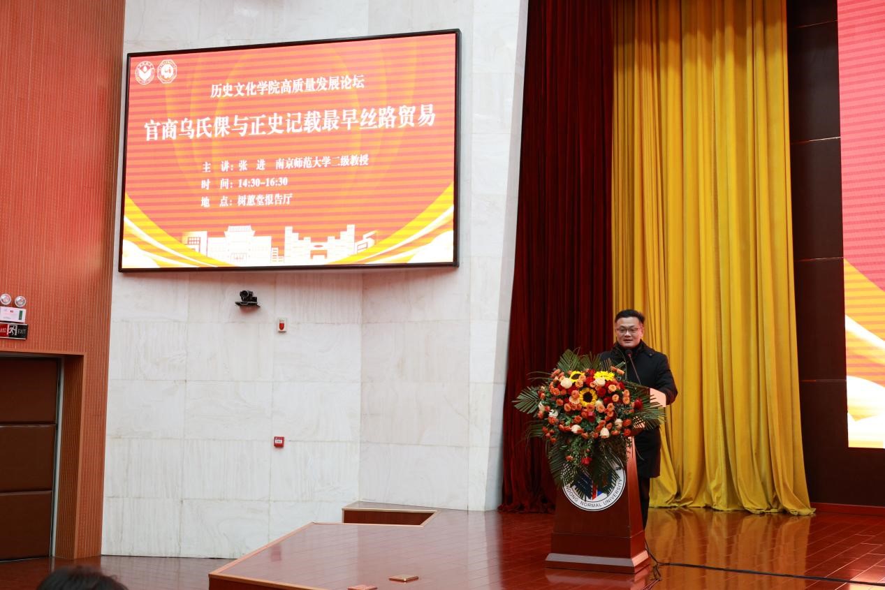 12 月 21 日,科研学术论坛“官商乌氏倮与正史记载最早丝路贸易”在山东师范大学长清湖校区树蕙堂报告厅举行。本次论坛由历史文化学院1984级校友、南京师范大学历史系教授、博士生导师张进主讲,300余名本科生参与,论坛由历史文化学院副院长赵树国教授主持。