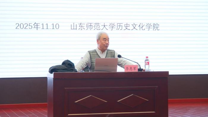 阔别深秋又一载,故友相聚情更长。11月10日上午,山东师范大学“社科大讲坛”再次邀请到我们的老朋友、全国著名历史特级教师、原上海市晋元高级中学历史教师李惠军开展讲座。此次,李老师将带领同学们在“情境·意境·语境”中探寻历史教育的“史学底色”与“教化价值”。历史文化学院教师教育中心主任、博士生导师楼建军教授出席并主持讲座。学院李晓华、燕慧副教授,青年教师祝介梅、孟晓雨,兼职硕士生导师赵然等嘉宾偕2023级全体本科生与2023、2025级教育硕士共同聆听李老师精彩的报告。伴随着李老师神采飞扬的深情问候与娓娓道来的历史叙事,活动在长清湖校区树蕙堂报告厅拉开帷幕。