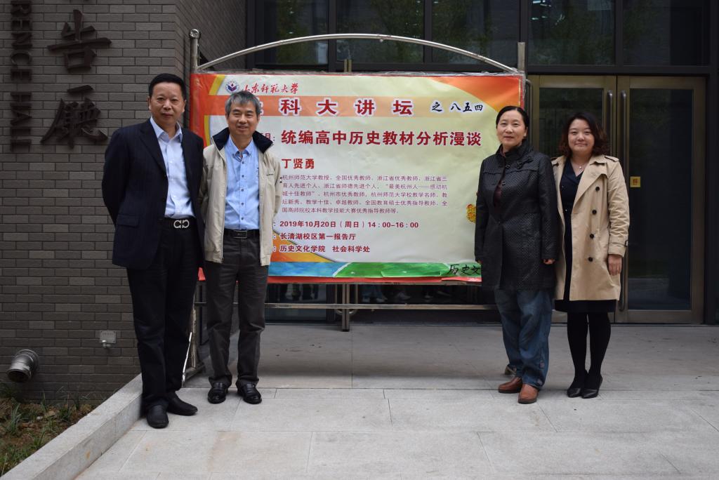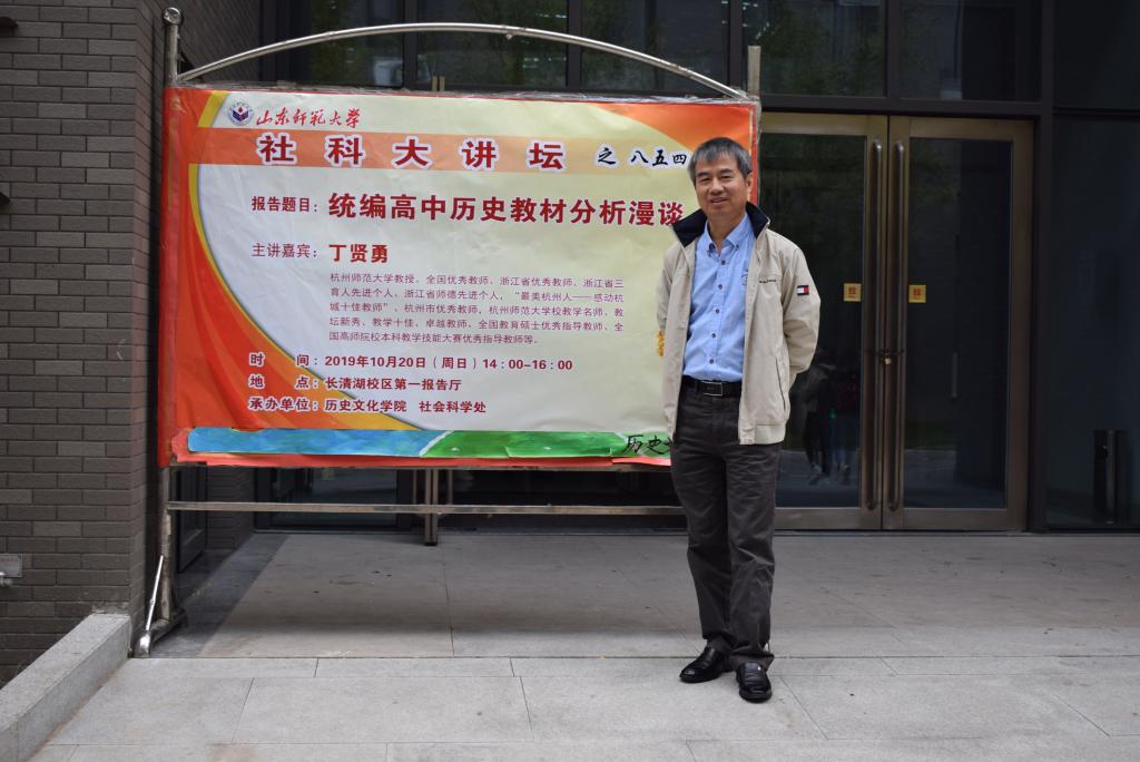 为促进学术交流,活跃气氛,10月20日,由学校社科处与历史文化学院联合举办的第854期社科大讲坛在长清湖校区第一报告厅开讲。本次社科大讲坛特别邀请全国优秀教师、全国高师院校本科教育技能大赛优秀指导教师、浙江省优秀教师、浙江省师德先进个人、杭州师范大学教学名师丁贤勇教授担任主讲人,做题为“统编高中历史教材分析漫谈”的学术报告。报告会由全国历史教师教育专业委员会常务理事、山东省历史教师远程研修专家库成员、山东师范大学历史文化学院硕士生导师楼建军副教授主持,山东师范大学历史文化学院教工第三支部书记、副教授李晓华,山东师范大学亚太研究中心副主任、历史文化学院副教授杨蕾以及三百余名学生共同聆听了此次讲座。