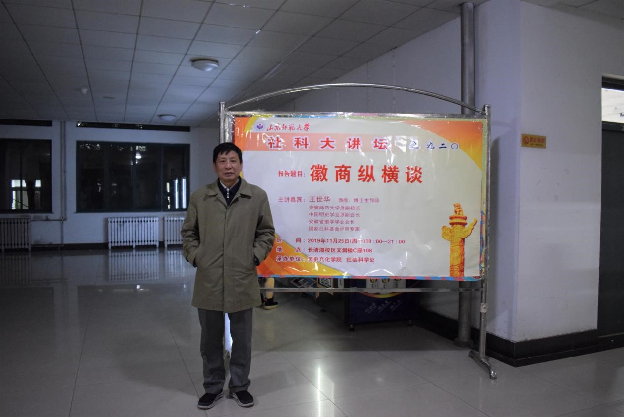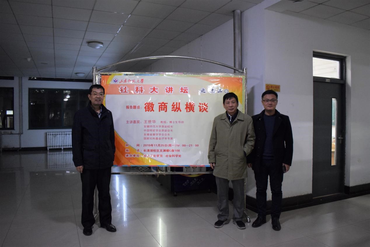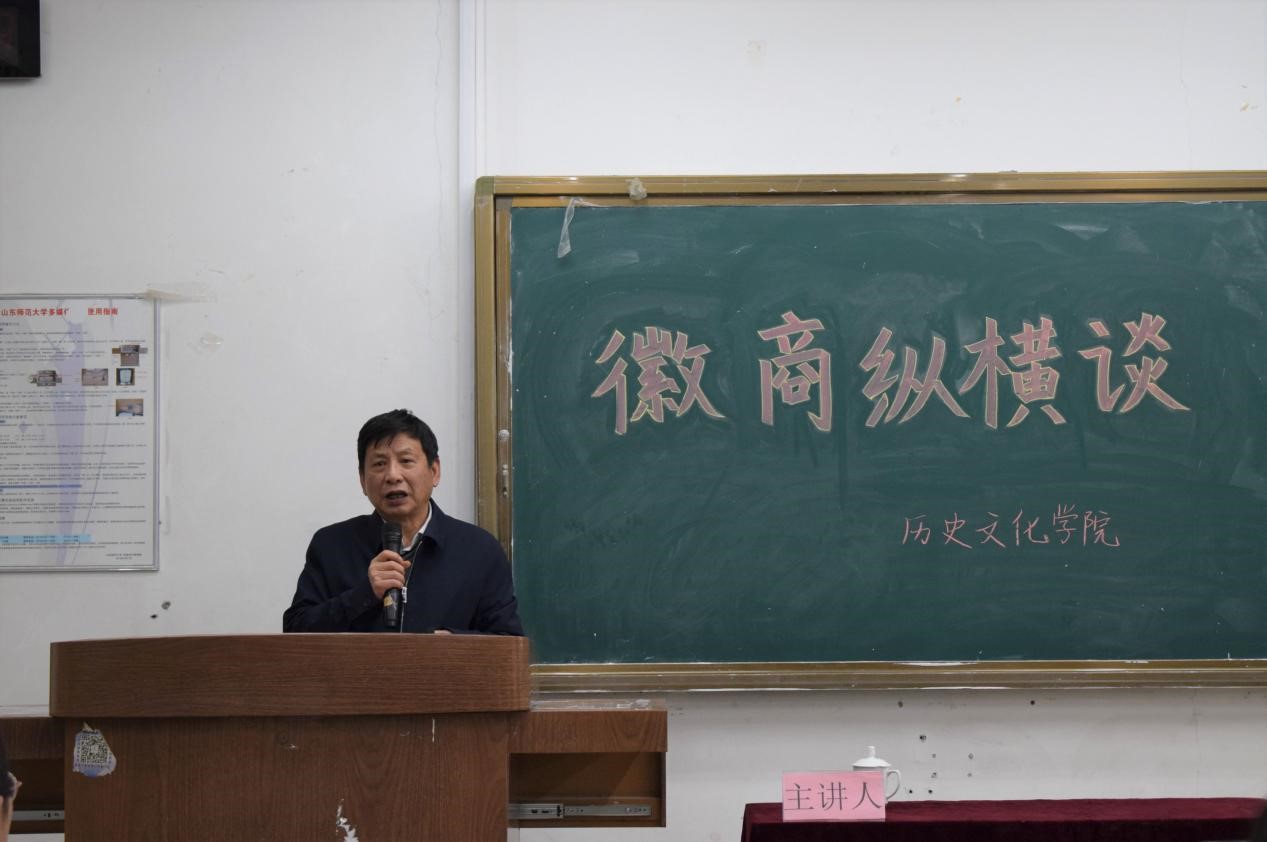 为促进学术交流,活跃学术气氛,11月25日,由历史文化学院与社会科学处联合举办的第920期社科大讲坛于长清湖校区文渊楼C区108教室开讲。本次社科大讲坛特别邀请安徽师范大学原副校长、中国明史学会原副会长、安徽省徽学学会会长、国家社科基金评审专家王世华教授担任主讲人,做题为“徽商纵横谈”的学术报告。报告会由山东师范大学历史文化学院副院长、硕士生导师赵树国主持,山东省委党校党史部副主任王巨新教授,山东师范大学历史文化学院中国史系主任、硕士生导师杜立晖,学院青年教师张婷婷与百余名学生共同聆听了此次讲座。