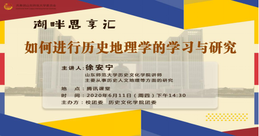6月11日,由校团委、历史文化学院团委联合举办的“湖畔思享汇”主题学术讲座线上开讲。历史文化学院讲师徐安宁以“如何进行历史地理学的学习与研究”为主题进行学术分享。学院2018级部分同学、2019级全体同学参与此次学术讨论。