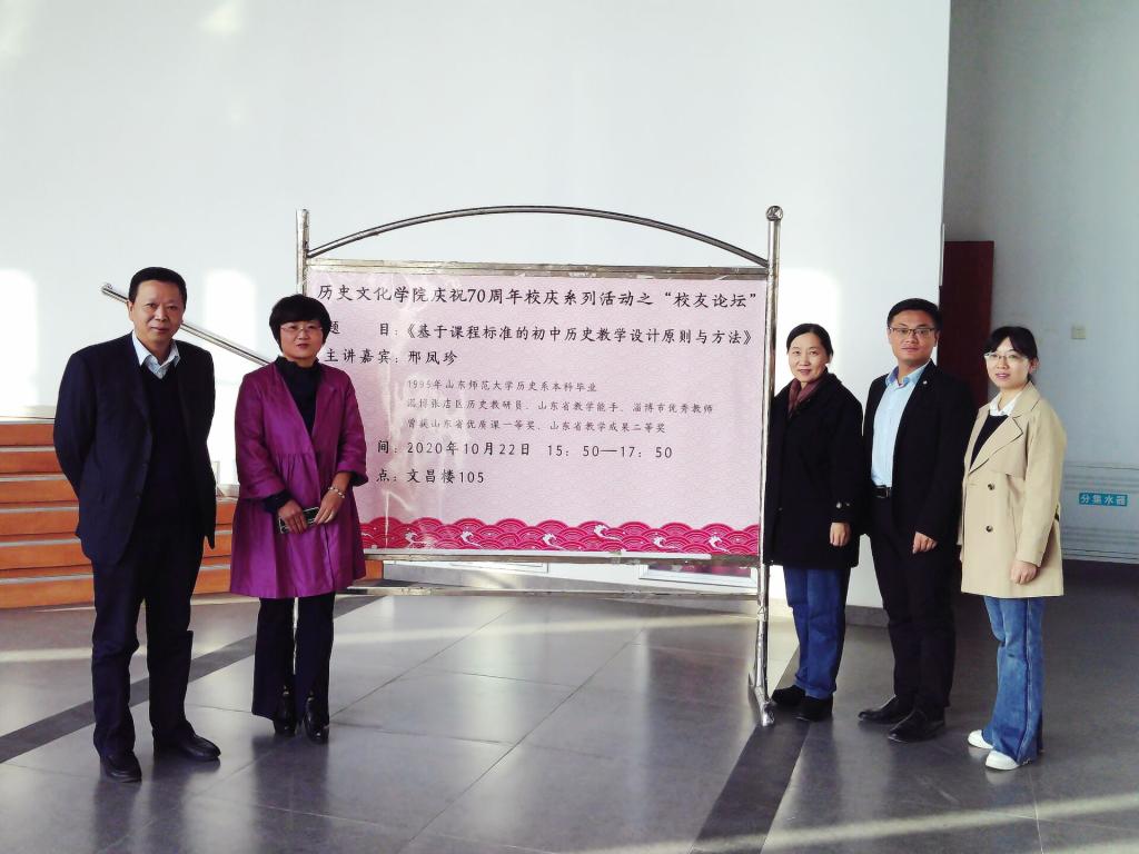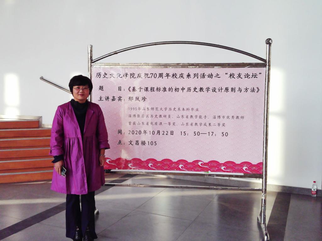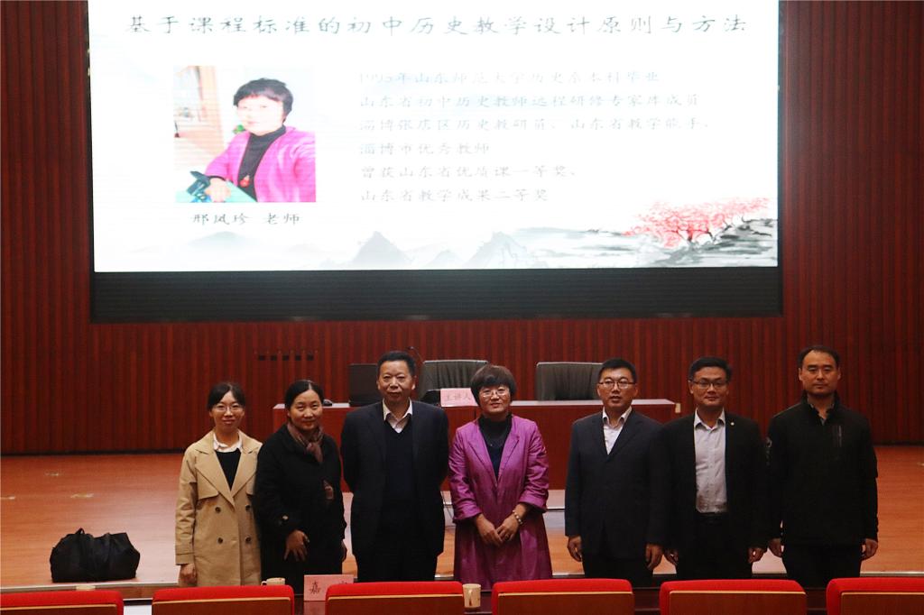 为了让学生们更好地了解初中历史教学的相关内容,10月22日下午,历史文化学院于长清湖校区文昌楼105会议室举办题为“基于课程标准的初中历史教学设计原则与方法”的报告会。本次报告会由我院91级校友,淄博市张店区历史教研员、淄博市优秀教师邢凤珍主讲。历史文化学院教师教育中心主任、硕士生导师楼建军副教授主持报告会。副院长、硕士生导师赵树国副教授,李晓华副教授,阎静副教授作为嘉宾出席本次报告会,我院部分学生参加报告会。