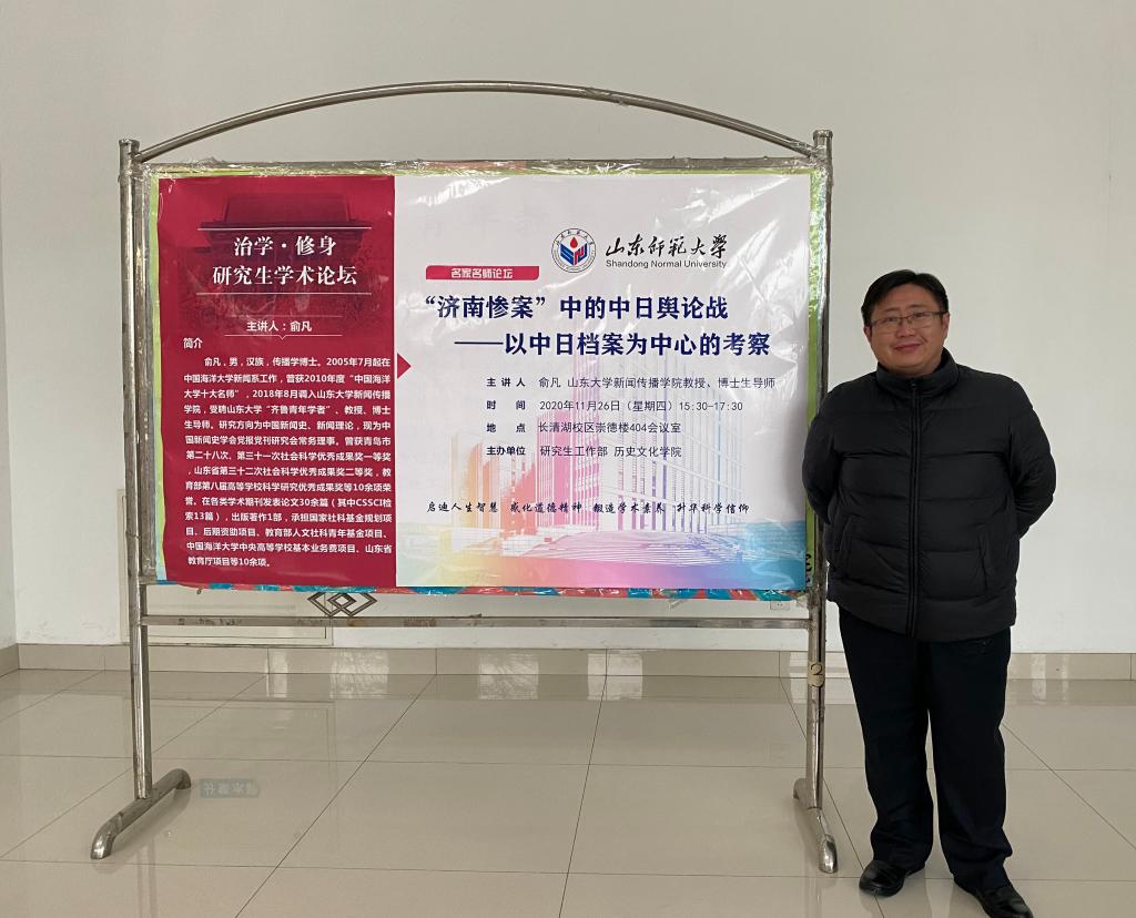 11月26日,由党委研究生工作部和历史文化学院主办的治学·修身——“名家名师”论坛在山东师范大学长清湖校区崇德楼404会议室成功举办。山东大学新闻传播学院教授、博士生导师俞凡应邀作了题为《“济南惨案”中的中日舆论战——以中日档案为中心的考察》的主题讲座。本次论坛山东师范大学历史文化学院教授、硕士生导师刘本森主持,学院各级研究生参加了此次讲座。