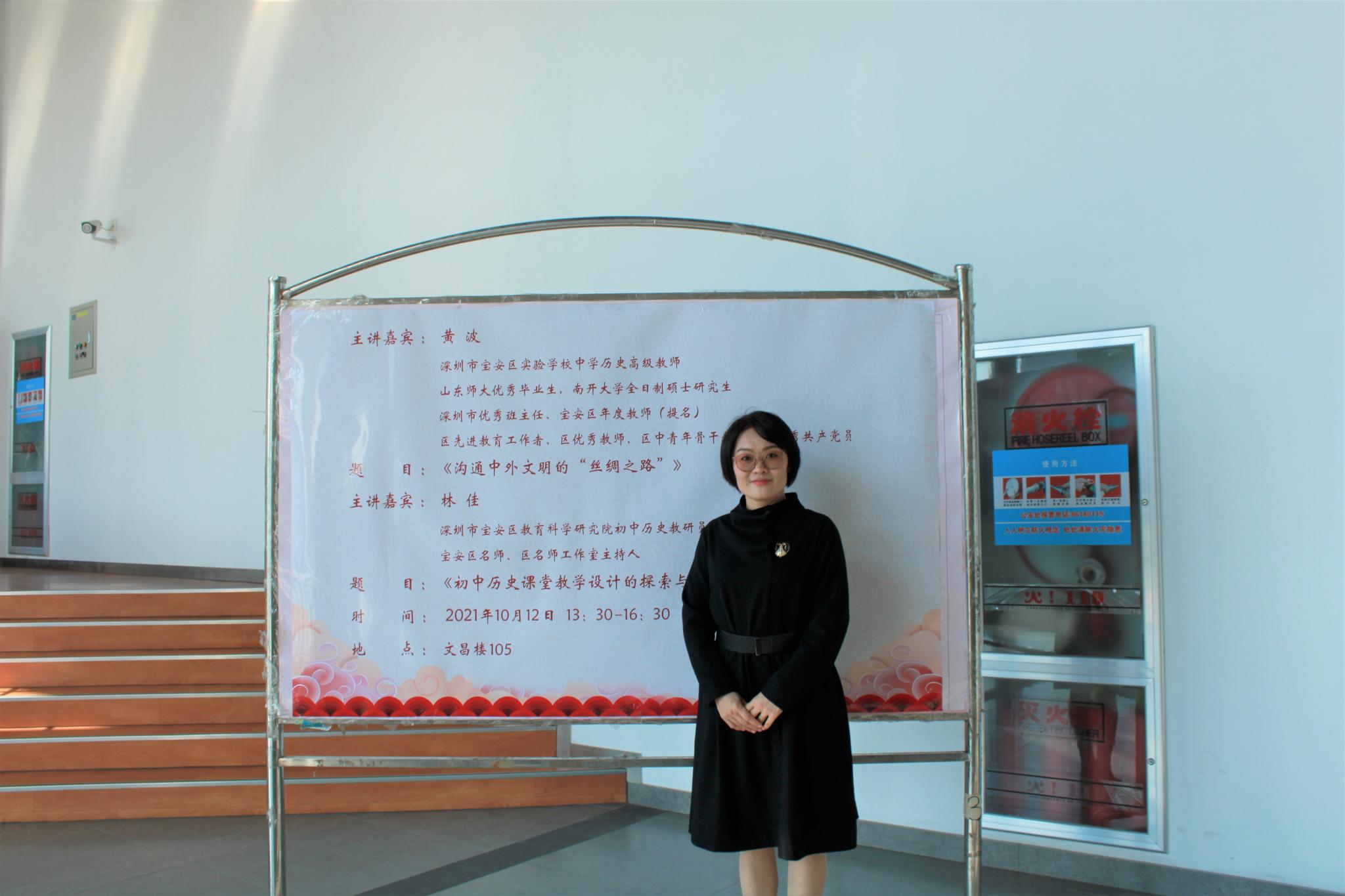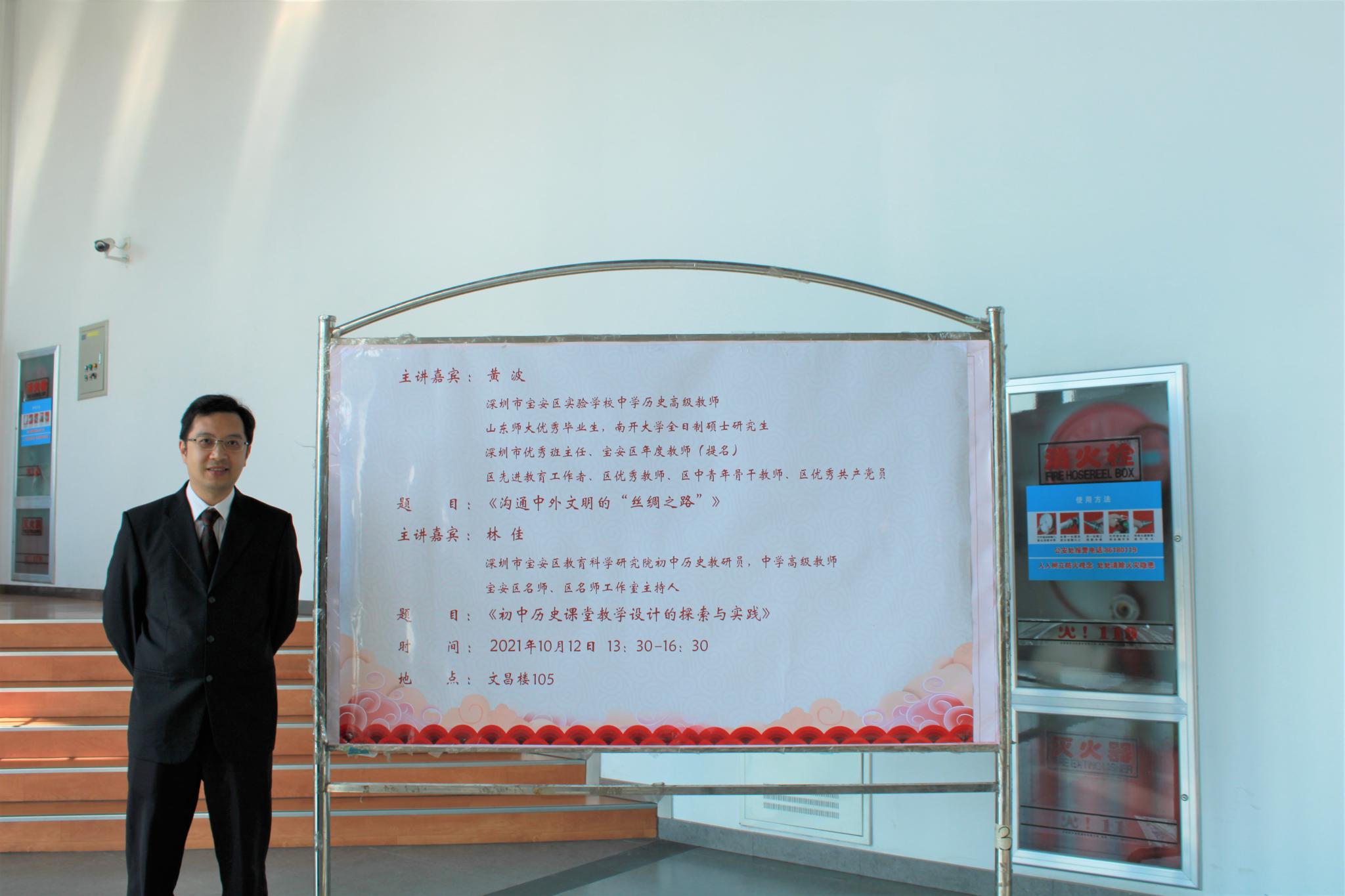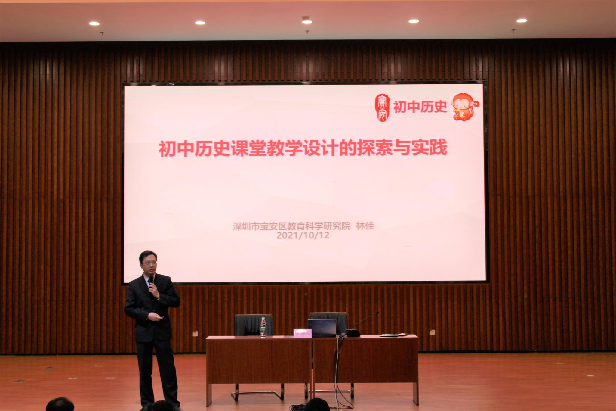 为提升同学们教育教学技能,更好地了解初中历史课堂教育教学工作,10月12日下午,历史文化学院于长清湖校区文昌楼105报告厅举办2019级教育见习观摩课和“初中历史课堂教学设计的探索与实践”讲座。本次讲座分为两场,由深圳市宝安区教育科学研究院初中历史教研员林佳和深圳宝安区中学历史高级教师黄波分别主讲。学院教师教育中心主任、硕士生导师楼建军副教授主持,学院李晓华副教授、杜学霞副教授、盖志芳副教授、阎静副教授、学院合作硕士生导师赵然、黄润青博士、团委书记魏宁作为嘉宾出席,学院2019级师范类专业本科生和2020级、2021级学科教学(历史)专业硕士生参加。