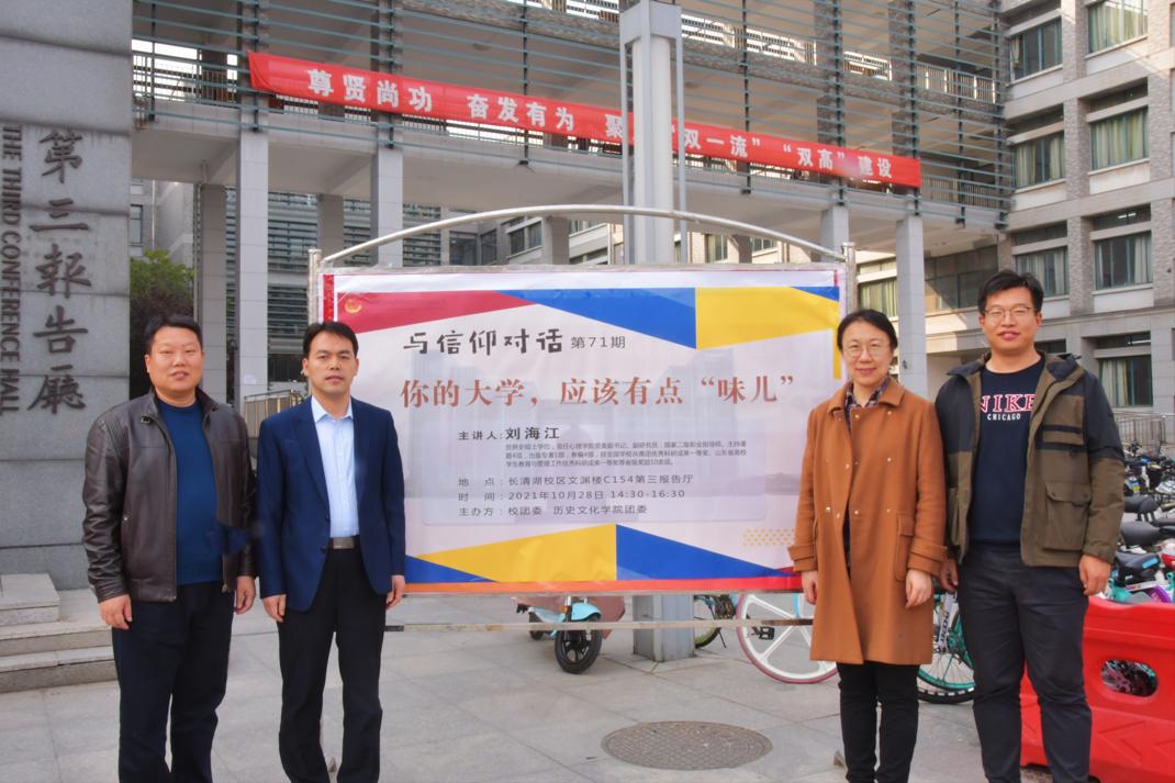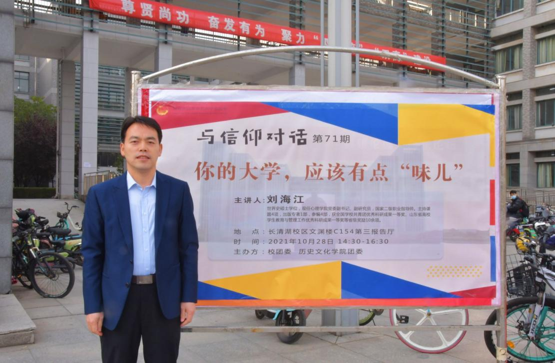 10月28日下午,由校团委主办、历史文化学院团委承办的与信仰对话之“你的大学,应该有点‘味道’”报告会在长清湖校区第三报告厅举行。报告会由山东师范大学心理学院党委副书记刘海江主讲。历史文化学院学生工作办公室主任、团委书记魏宁,辅导员衣晓杰和2021级全体同学参加报告会。报告会由历史文化学院党委副书记鲁法军主持。