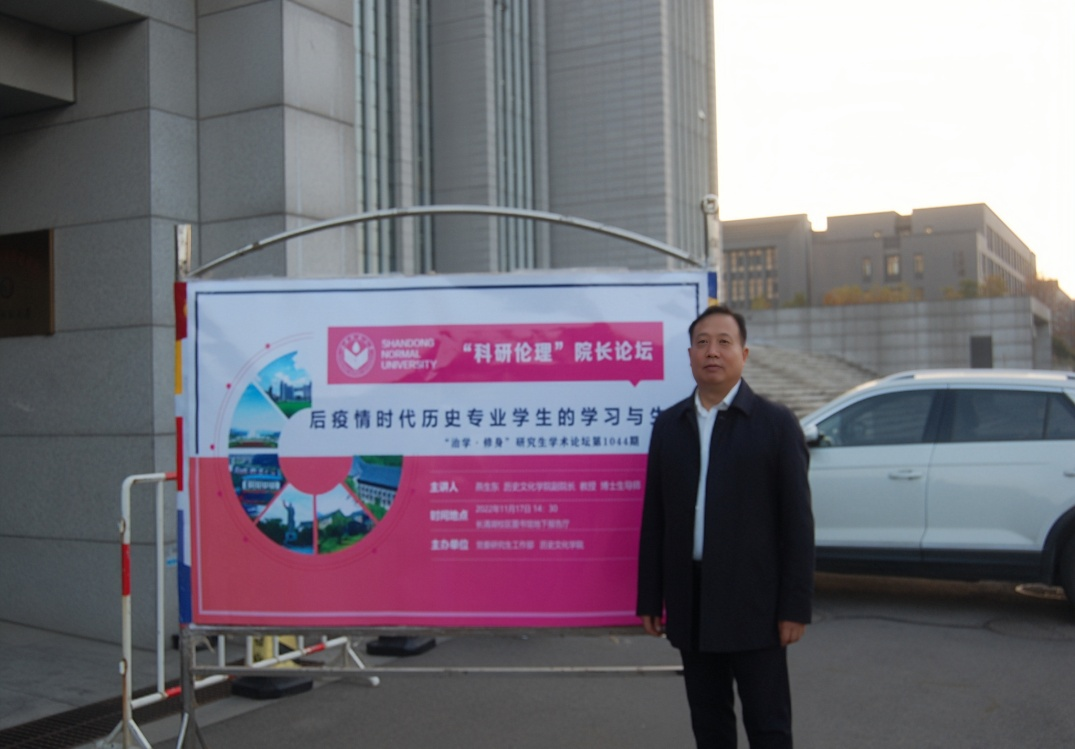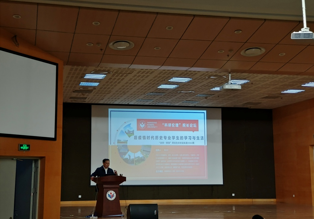 2022年11月17日下午,由山东师范大学党委研究生工作部和历史文化学院联合主办的研究生“科研伦理”院长论坛在长清湖校区图书馆地下报告厅成功举办,历史文化学院副院长、博士生导师燕生东教授应邀作了以“后疫情时代历史专业学生的学习与生活”为主题的讲座。本次论坛由辅导员郭慧颖老师主持,学院各级研究生、本科生参加了此次讲座。