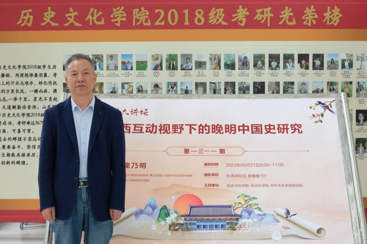 为提高学术能力,扩展学术视野,5月21日上午,由山东师范大学历史文化学院、社会科学处、中外关系史创新团队举办的第1311期社科大讲坛于长清湖校区崇德楼107教室开讲。本期社科大讲坛特邀南开大学历史学院庞乃明教授担任主讲人,进行了以“中西互动视野下的晚明中国史研究”学术讲座,河西学院历史系崔云胜教授,学院张婷婷副教授、青年教师闫福新出席讲座,本科生、研究生近百人聆听。讲座由朱亚非教授主持。