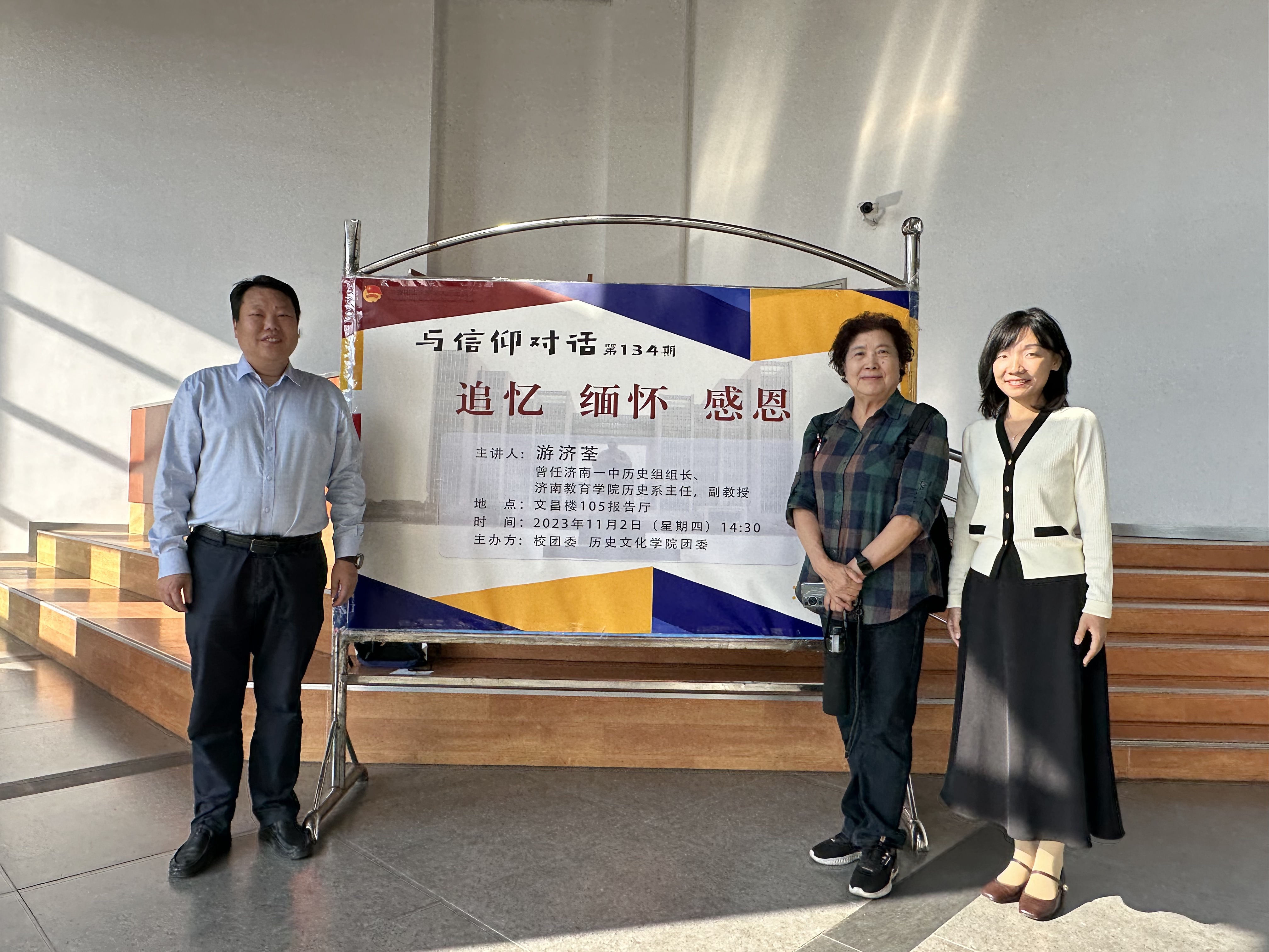 11月2日下午,由校团委、历史文化学院团委联合举办的“与信仰对话”第134期“追忆 缅怀 感恩”讲座在长清湖校区文昌楼105报告厅举行。本次讲座由曾任济南一中历史组组长、济南教育学院历史系主任,副教授、学院1978级校友游济荃担任主讲,历史文化学院党委副书记鲁法军,团委书记、2023级辅导员董欣及2023级全体同学参加。