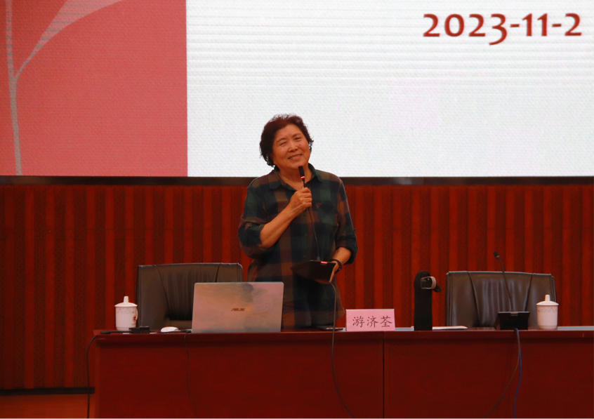 讲座伊始,鲁法军对游济荃的个人信息进行介绍。游济荃首先分享了游姓的起源并于其中贯穿历史知识。随后,游济荃讲述自己与山师的“缘”:游济荃的父亲是被誉为“山师老黄牛”的游源修,自己可谓是土生土长的山师子弟,以及自己在1965-1978年的兵团岁月和1978年之后的求学、工作历程及退休生活。在本次讲座中,游济荃追忆了自己的父亲,感恩自己一路走来对她给予帮助的朋友、师长等人,并表达自己对“天地君亲师”的理解:对天地,也就是大自然要有敬畏之心;对亲人师长的敬仰、爱戴以及对他们的感恩之心;对朋友的有爱之心。讲座进入尾声,游济荃向同学们抒发临别赠言:“天生我材必有用”“谋事在人,成事在天”“有志者,事竟成”,把自己撰写的两本书送给历史文化学院,并且在现场向大家演唱《在希望的田野上》,本次讲座在同学们的热烈掌声中落下帷幕。
