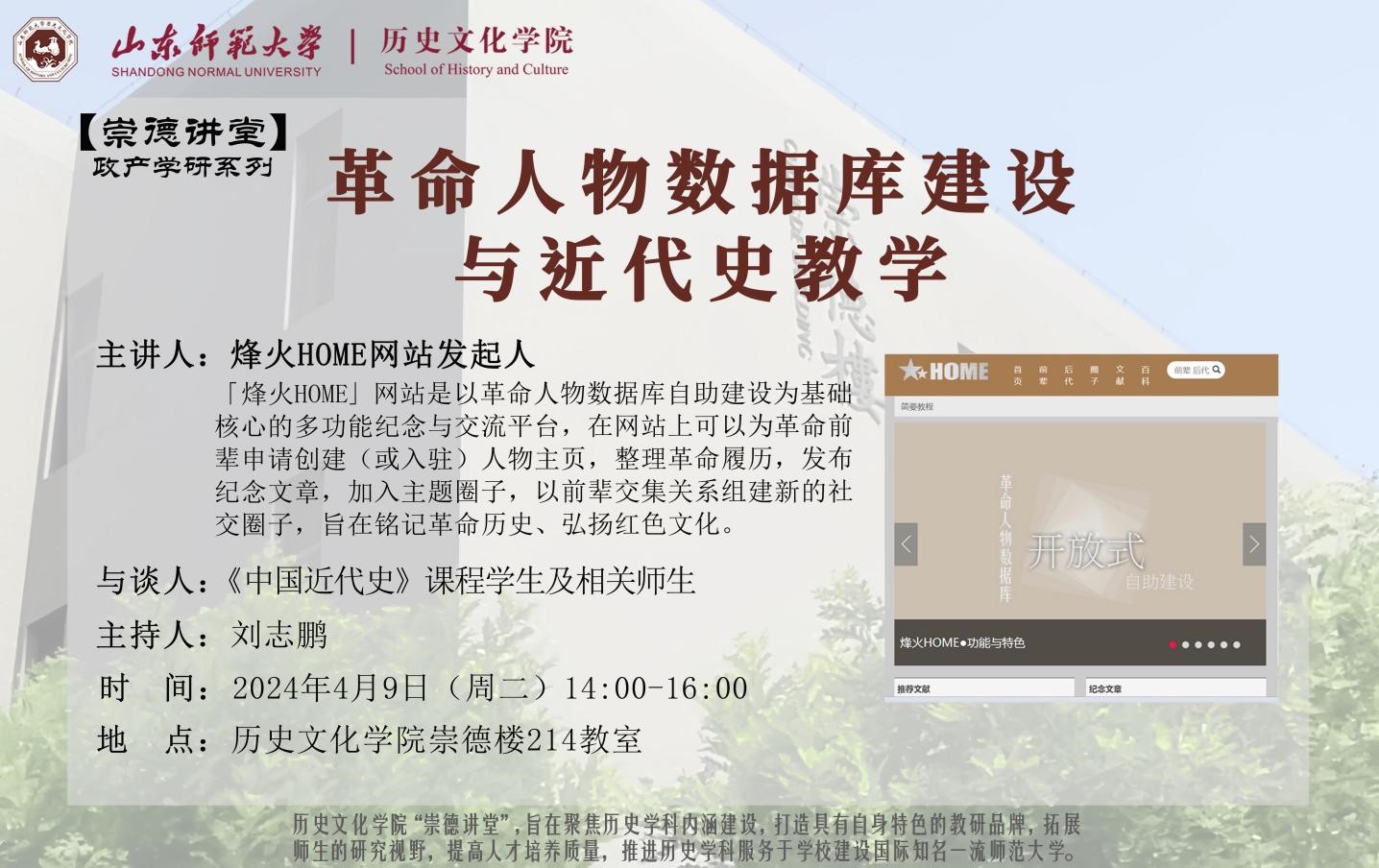 本期崇德讲堂将于2024年4月9日下午14:00-16:00于长清湖校区历史文化学院崇德楼214教室举办。本讲将由院长助理刘志鹏教授主持,特别邀请烽火HOME网站发起人主讲;课堂的主题为《革命人物数据库建设与近代史教学》;《中国近代史》课程学生及相关师生与谈。