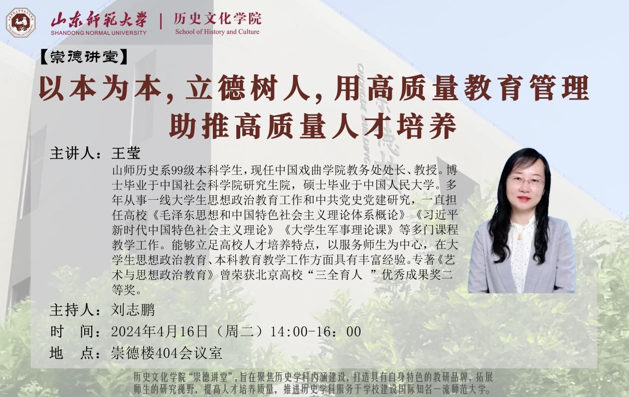 本期崇德讲堂将于2024年4月16日下午14:00-16:00于长清湖校区历史文化学院崇德楼404会议室举办。本讲将由院长助理刘志鹏教授主持,特别邀请中国戏曲学院教务处处长、教授,山东师范大学历史系99级本科学生王莹担任主讲;课堂的主题为《以人为本,立德树人,用高质量教育管理助推高质量人才培养》。