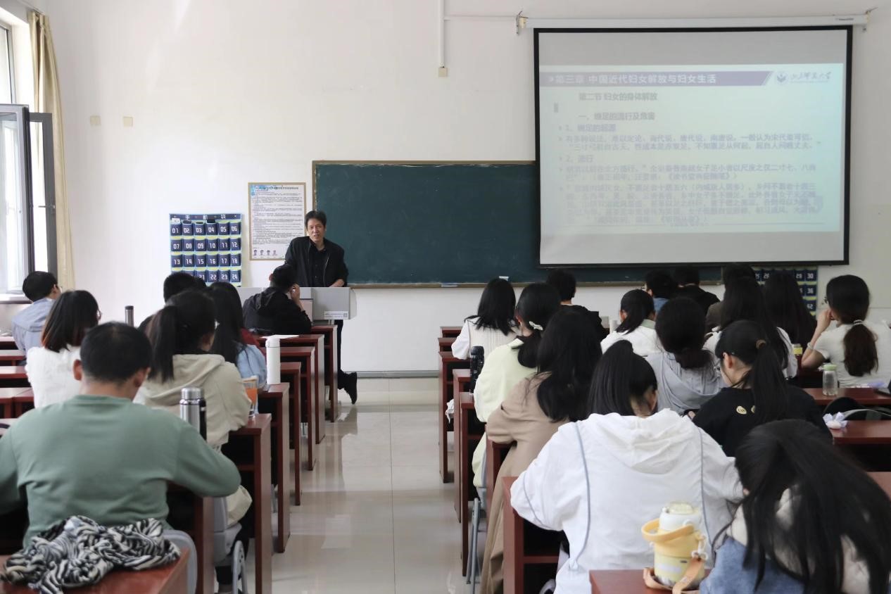 观摩课伊始,王林教授从妇女缠足的起源为切入点,引出了妇女缠足从兴起到兴盛的过程,并通过丰富的史料让学生更加生动的了解到缠足的起源和发展历程;引经据典指出了缠足的危害:缠足严重影响了后代健康和民族形象,有百害而无一利。王林随后向大家介绍了“近代不缠足运动”的兴起,列举“太平天国运动”、“戊戌变法”等多个实例,向大家展现了不缠足运动的兴起发展以及对近代中国社会的影响。最后,王林指出身体素质对于一个民族政治发展的重要性,并向大家推荐了研究近代妇女解放的有关书目。