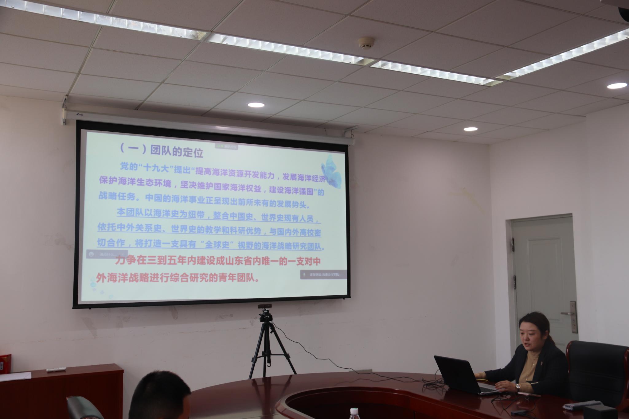 接着,进入项目汇报环节,该环节由孙晓光教授主持,团队负责人杨蕾从“团队设立的定位和意义”、“团队的架构和组建基础”、“团队的研究内容和目标”三方面对团队建设进行汇报。其中,明确了团队的建设目标是以海洋史为纽带,整合山东师范大学历史文化学院中国史、世界史学科现有人员,依托中外关系史、世界近代史的教学和科研优势,与国内外高校密切合作,打造一支具有“全球史”视野的海洋战略研究团队。力争在三到五年内将该团队建设成山东省内唯一的一支对中外海洋战略进行综合研究的青年团队。