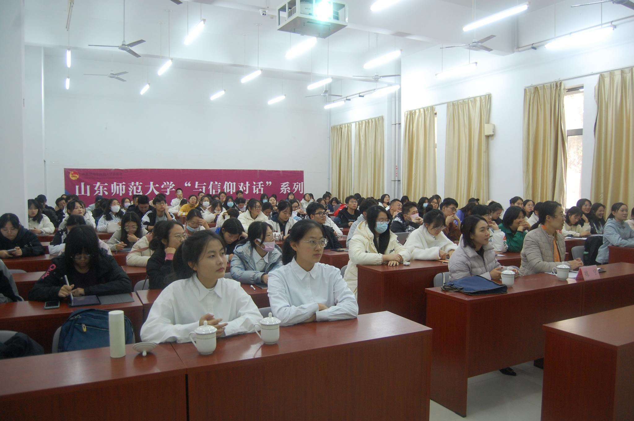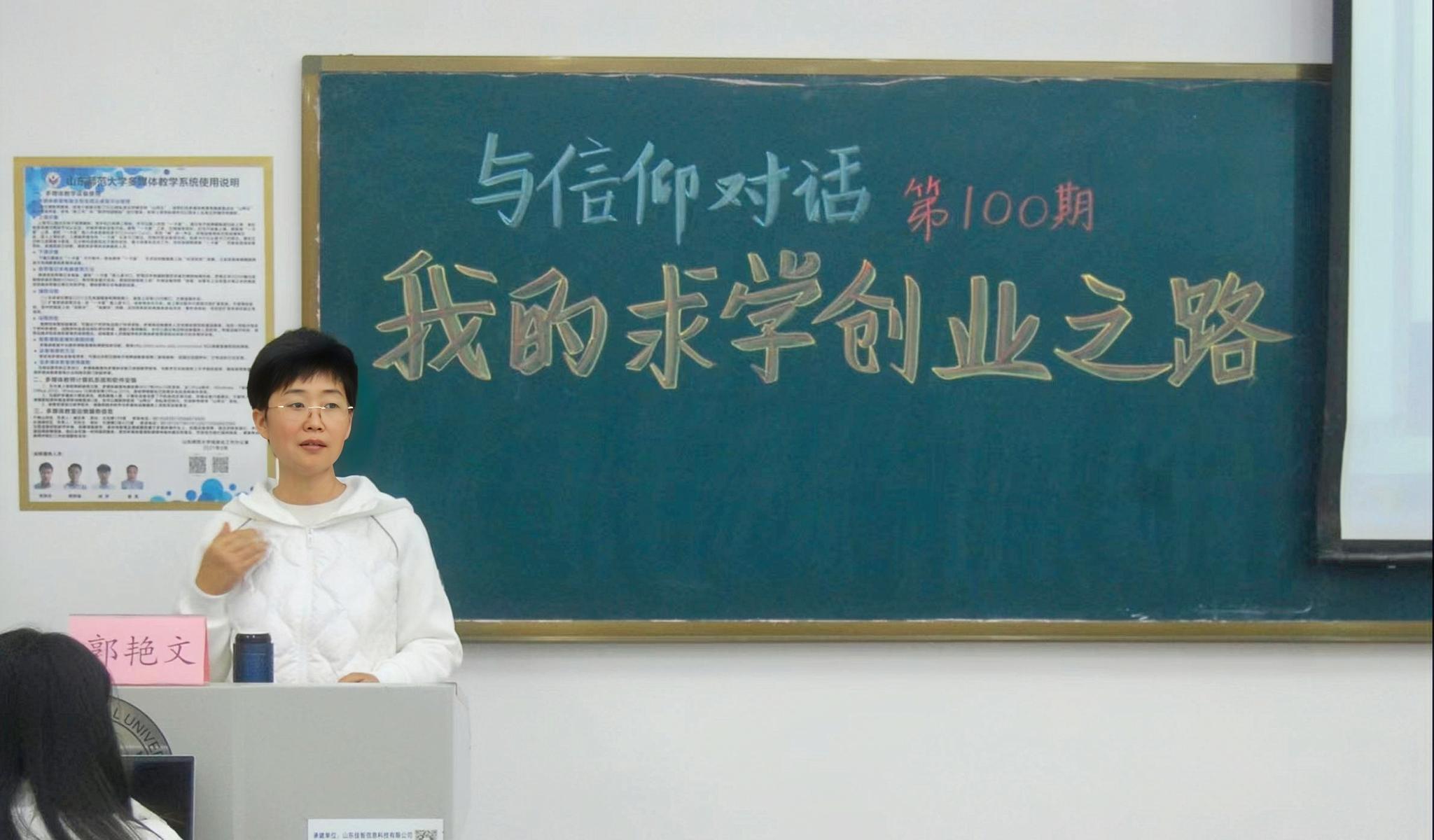 11月3日下午,由校团委、历史文化学院团委主办的“与信仰对话”第一百期“我的求学创业之路”讲座在长清湖校区崇德楼114教室举办。本次讲座由山东师范大学优秀校友、山东齐鲁融媒乡村振兴研究院有限责任公司总经理郭艳文担任主讲人,学工办主任、团委书记魏宁主持讲座,学院全体团校学员与部分本科生参加讲座。