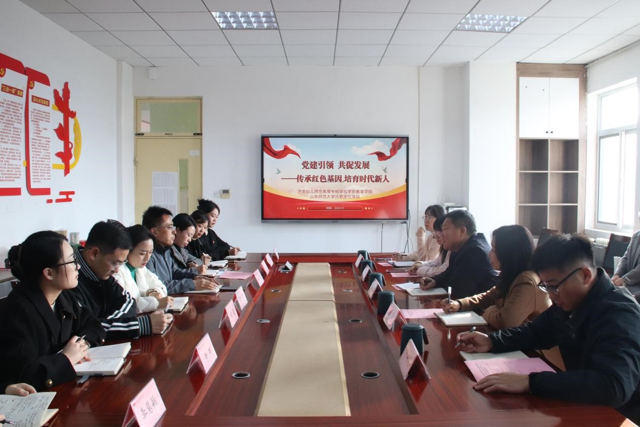 2024年11月20日下午,历史文化学院师生赴济南幼儿师范高等专科学校学前教育学院联合开展党建共建活动。学院党委副书记、纪委书记鲁法军、团委书记、学工办主任董欣、全体辅导员及学生代表,济南幼儿师范高等专科学校学前教育学院党总支书记杨勇、党总支副书记赵越、学工办主任张晋及辅导员代表参加本次活动。活动围绕“党建引领,共促发展——传承红色基因,培育时代新人”主题展开,取得圆满成功。