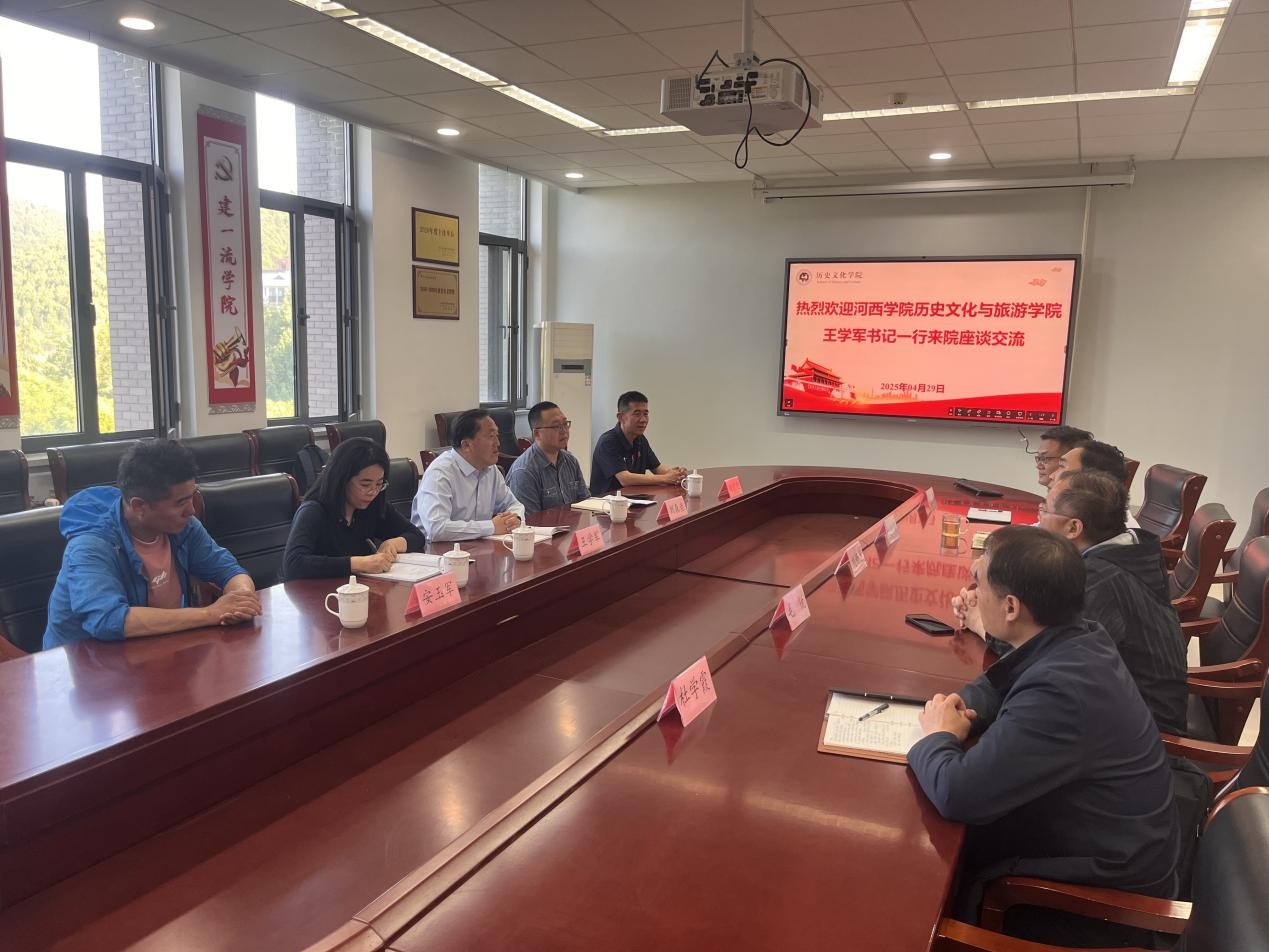 4月29日,河西学院历史文化与旅游学院党委书记王学军、副院长刘森垚一行莅临我院开展座谈交流。历史文化学院党委书记刘新生,院长毛锐,副院长赵树国等参加活动。