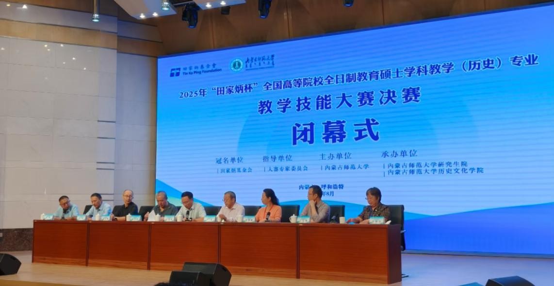8月22日至26日,由田家炳基金会主办、内蒙古师范大学承办的2025年全国田家炳杯全日制教育硕士专业学位研究生学科教学(历史)专业教学技能大赛在“云中青城”呼和浩特举行,来自全国84所院校的163名参赛选手齐聚一堂,我院竞赛队伍由楼建军领队参赛,共赴盛会。24级硕士研究生曹燕群、王雨晴在指导教师楼建军、燕慧及校外导师赵然带领下参赛。经过激烈角逐,曹燕群获大赛一等奖,王雨晴获三等奖,楼建军教授获“优秀指导教师奖”,两位选手的教学设计同时荣获“优秀教学设计奖”。