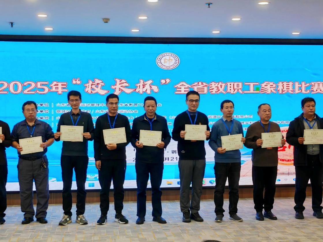 11月23日,2025年首届山东省“校长杯”教职工象棋比赛在济南市钢城区新兴大厦落下帷幕。本次比赛吸引了来自全省高等学校及各地市教育工会的42支精英代表队齐聚一堂,共逐锦标。经过九轮智慧与耐力的精彩交锋,我校楼建军、宋凯玉、林志刚、冯绍卿、赵保波五位教师组成的代表队凭借出色发挥,最终荣获团体第十名,将“高校组团体优秀奖”收入囊中。其中,历史文化学院楼建军教授在强手如林的教职工组中九战六胜一和两负,最终斩获个人第九名的优异成绩。