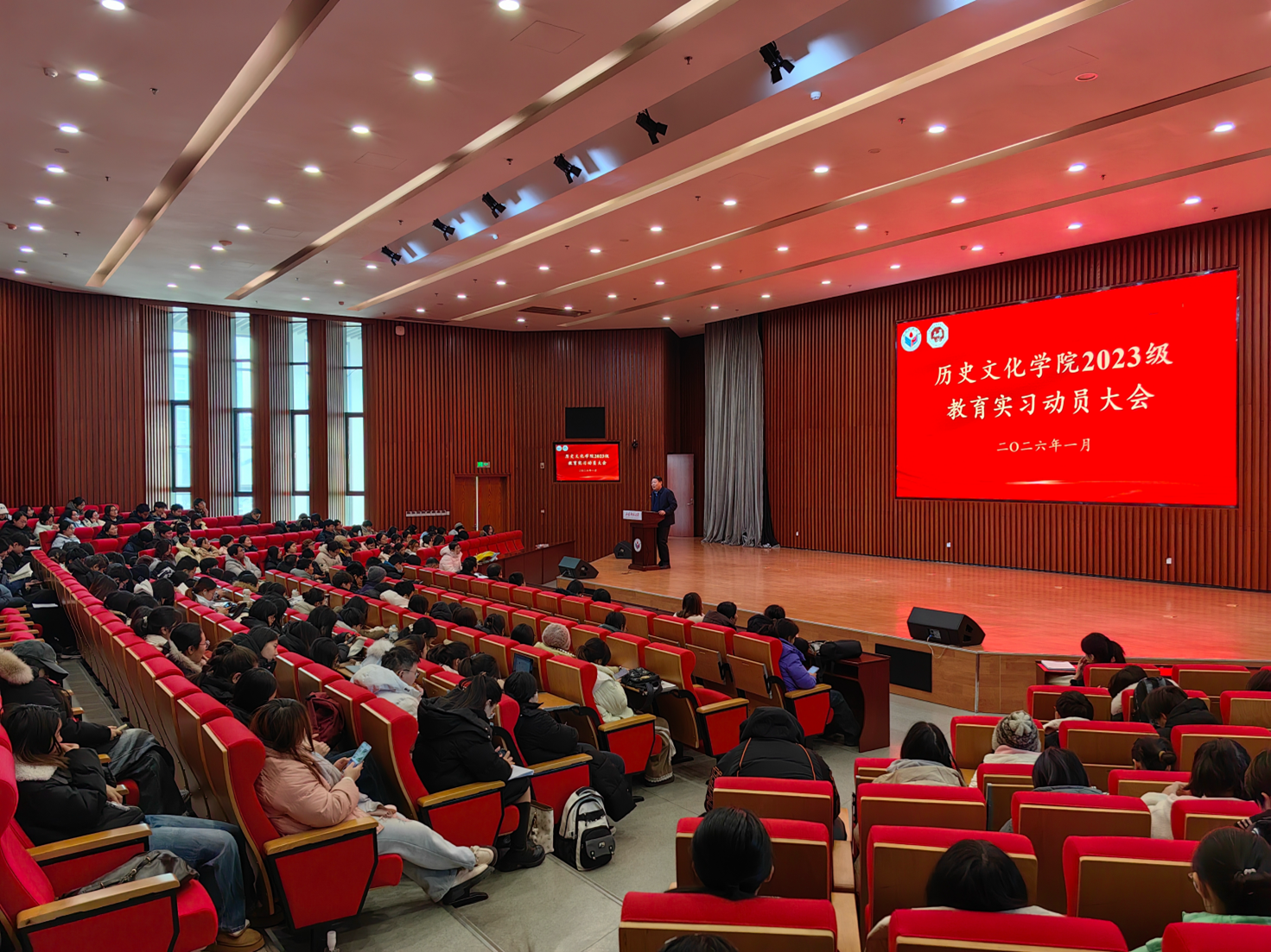 1月23日上午,历史文化学院于长清湖校区文昌楼105报告厅召开2023级教育实习动员大会。学院党委副书记、纪委书记鲁法军,学术副院长刘志鹏,教师教育中心主任楼建军,学工办主任、团委书记董欣,全体实习指导教师出席会议。会议由董欣主持。