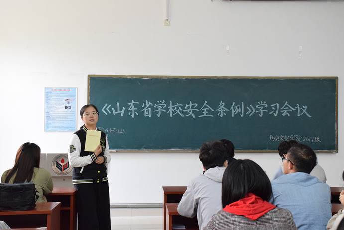 为增强学生安全意识,确保假期安全,4月28日,历史文化学院于长清湖校区崇德楼114教室举行《山东省学校安全条例》学习会议。辅导员林淑玉主讲,2017级全体同学积极参与本次会议。