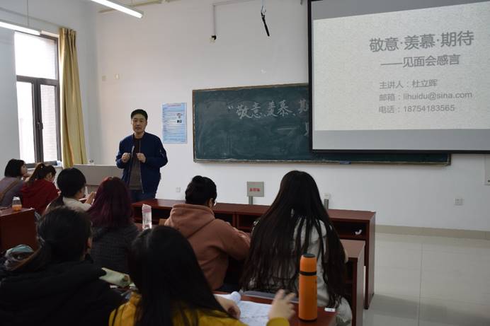 会议伊始,杜立晖进行了简短的自我介绍,然后以中国式高校教育中老师与学生的关系松散程度为切入点正式开始本次会议。他讲到,现在大学老师与学生关系十分松散,而自己非常荣幸,能以班主任的身份和同学见面。接着,杜立晖依次从“敬意”、“羡慕”、“希望”三方面讲述自己的见解。结合自身求学过程,他表示,对于同学们面对如此激烈的学业竞争下能够顺利考入山师感到非常敬佩。他羡慕同学们在这个年龄,这个时间,能够坐在这里学习。同时他也希望班级里每一个同学都有一个非常美好的前景,毕业后的发展超出他的期待。最后,杜立晖为同学们提出建议,他认为在剩下的大学生活中,同学们应提早完成未来人生规划,奋斗努力,不虚度光阴,珍惜现在的大好时光,不断提升自身能力,为自己的未来做一个完美的铺垫。