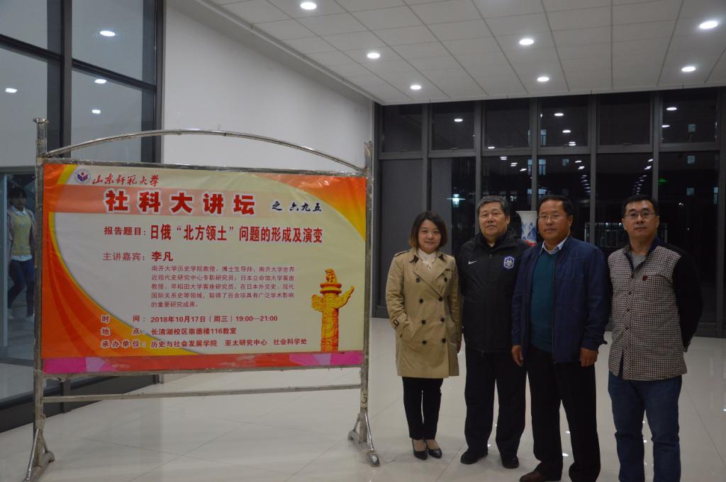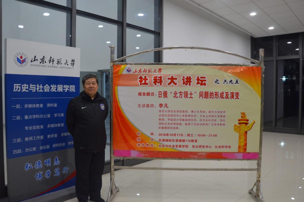 为活跃学术氛围,加强学术交流,10月17日,由历史与社会发展学院和亚太研究中心、社会科学处联合举办的第695期社科大讲坛在长清湖校区崇德楼116教室开讲。本次社科大讲坛特别邀请南开大学历史学院博士生导师、日本早稻田大学客座研究员李凡教授担任主讲人,做题为“日俄‘北方领土’问题的形成及演变”的学术报告。讲座前,历史与社会发展学院院长毛锐教授会见了李凡教授。报告会由山东师范大学亚太研究中心主任、历史与社会发展学院二级教授、博士生导师孙立祥主持,历史与社会发展学院副教授、山东师大亚太研究中心副主任杨蕾,历史与社会发展学院副教授、山东师大东岳学者刘志鹏,青年教师刘昌鑫等老师和一百多名本科生、研究生学生共同聆听了此次讲座。