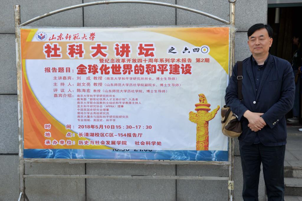 为活跃学术气氛,加强学术交流,积极响应国家“纪念改革开放四十周年”的号召,5月10日,由历史与社会发展学院和社会科学处联合举办的第640期社科大讲坛暨纪念改革开放四十周年系列学术报告第2期在长清湖校区综合教学楼C区154教室开讲。本次社科大讲坛特别邀请南京大学和平学研究所所长,博士生导师刘成教授,做题为“全球化世界的和平建设”的学术报告。报告由历社学院副院长,博士生导师赵文亮教授主持,博士生导师陈海宏教授担任评议人,学院内外300余名研究生、本科生共同聆听了此次讲座。