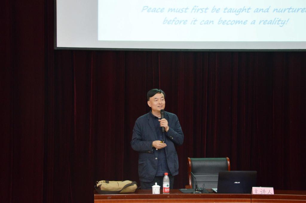 刘成首先通过展示国家、民族、宗教中的四种交往关系模式,讲述了世界由单一到多样到互动再到融合的交往模式。他详细介绍了全球经济网络由多样性逐渐走向一致性的发展过程并通过图片“Non-Violence”的存在与否来阐释和平的文化只能用非暴力来实现,他陈述了发达国家和发展中国家面临着共同的环境问题,并以此为基础引出世界全球化、一体化的时代背景。刘成引用“种瓜得瓜,种豆得豆”的俗语,反思人类的自然发展规律及历史战争原因,指出历史发展中用暴力革命手段换取世界和平的说法是非正义的行为,他强调国际活动的目标与行动必须一致,必须以树立非暴力的目标为前提并延续非暴力的路径,由此建设和平的世界。随后,刘成通过讲述鲁迅的文章《药》及现代制度等因素的安排来深刻剖析权利与暴力的关系,阐释权力是导致暴力的可能性之一。他认为暴力冲突分为直接暴力(行为)、文化暴力(态度)、结构暴力(矛盾状态)三种,三者之间形成三角循环结构。与暴力相对应的和平也分为直接和平、文化和平和结构和平三种,而直接和平分为积极和平和消极和平两类。由此,他指出人类对暴力的认识决定了人类对和平的认识的深刻程度。他建议联合国的发展应走非暴力方向并提倡国内外高校开设关于和平学的课程,让和平走进中外学生课堂。接下来,刘成通过讲述他游历柬埔寨的经历,引用不同国家关于“不随地吐痰”意识不同的案例,得出文化的不同源于文化的时间间隔,并非文化差异的结论。他通过整体视角与局部视角的多角度分析,类比战争与和平的关系。他多次强调不同的人类只是有不同的特殊性,但并非不同性,正是共同的本性激发人类对和平的向往,不应用文化的差异作为战争的借口,应包容文化的特殊性。而后,刘成介绍了和平时代背景下有限的资源情况导致了冲突的产生和激化。并指出,冲突无法消除,需要在直接环境与冲突转化理论的基础上通过冲突管理的方法来化解冲突,进行和解。同时,需要平衡真相、仁慈、正义、和平四个方面的因素,以达到真正的和解。