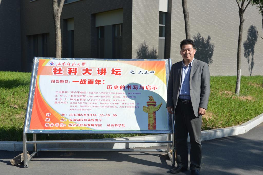 5月3日,由历史与社会发展学院和社会科学处联合举办的第634期社科大讲坛在长清湖校区新报告厅开讲。本次社科大讲坛特别邀请我国著名世界现代史学者,首都师范大学教授、博士生导师、燕京学者,首都师范大学研究生院常务副院长梁占军担任主讲人,做题为“一战百年:历史的书写与启示”的学术报告。报告由历社学院副院长、博士生导师赵文亮教授主持,博士生导师陈海宏教授担任评议人,青年教师刘昌鑫,辅导员王泽方及学院两百余名研究生、本科生学生共同聆听了此次讲座。
